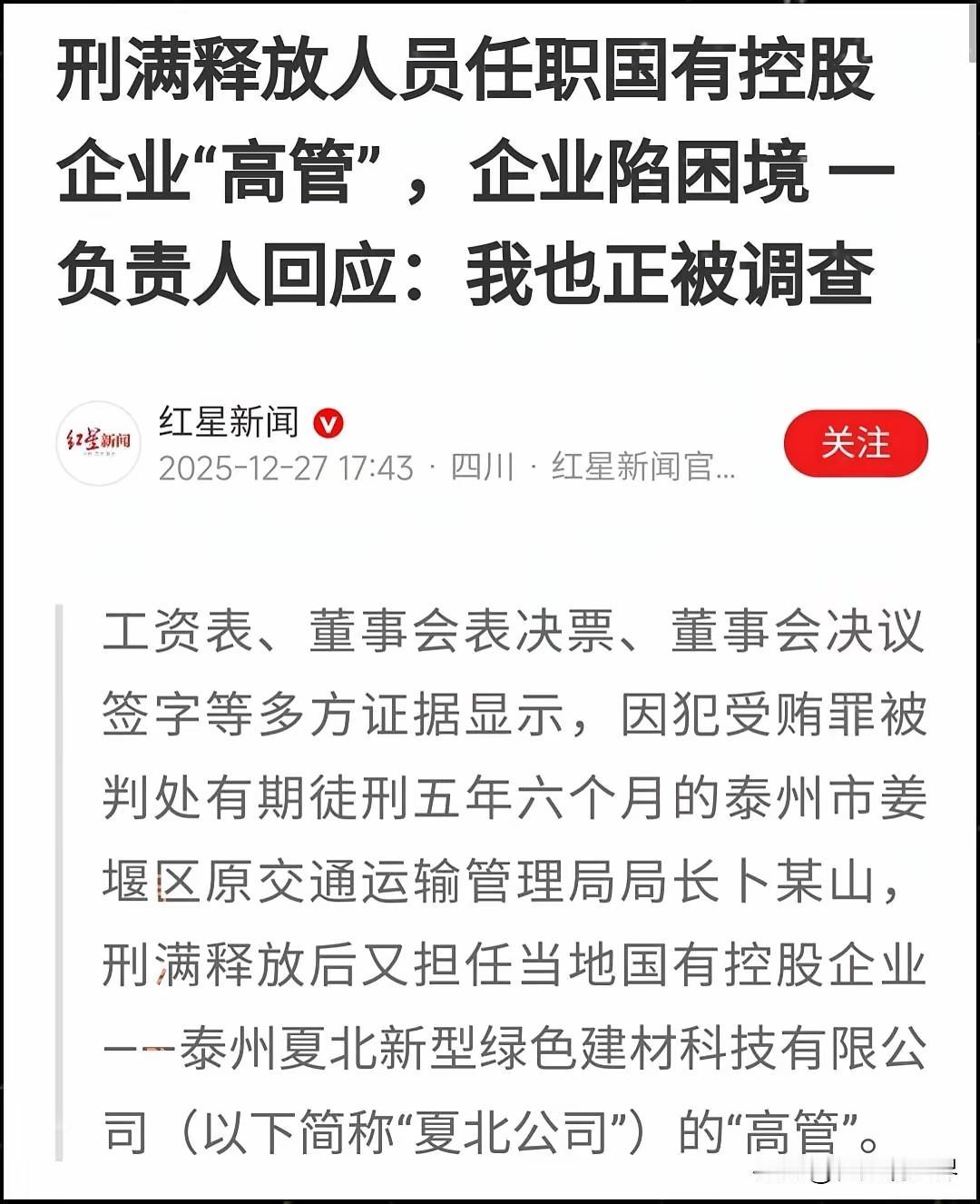 网上看见一条消息:受贿局长出狱变国企高管,5年领薪58万!我半信半疑,如果不是假新闻,那可真的是离谱他妈给儿子开门……离谱到家了! 这无疑是给想贪而不敢贪的官员树立了光辉楷模,大胆的贪吧,未来可期!大胆的贪吧,即便是倒霉进监狱,出来照样飞黄腾达!加油贪吧,贪官们的日子永远差不了! 这就是贪官们有恃无恐的真实写照。 图片来自网络。