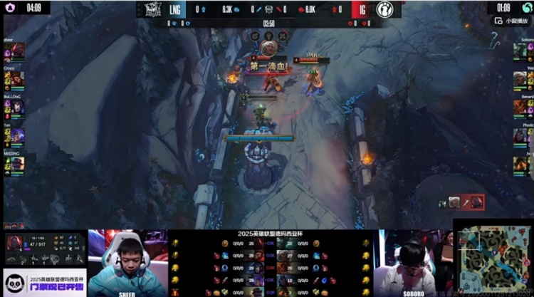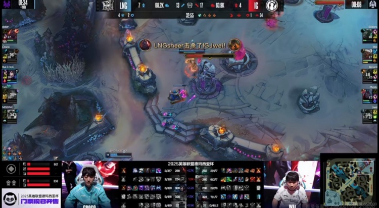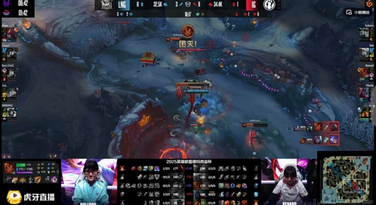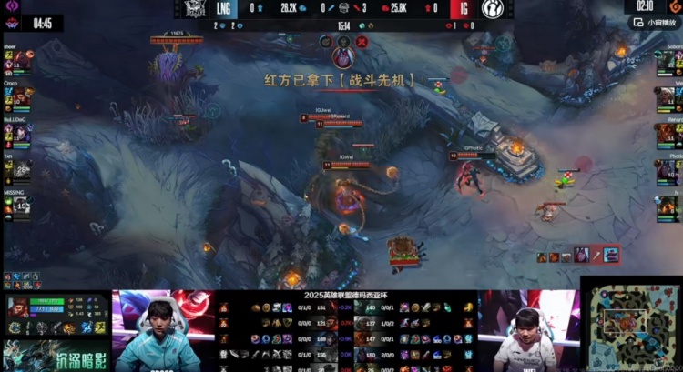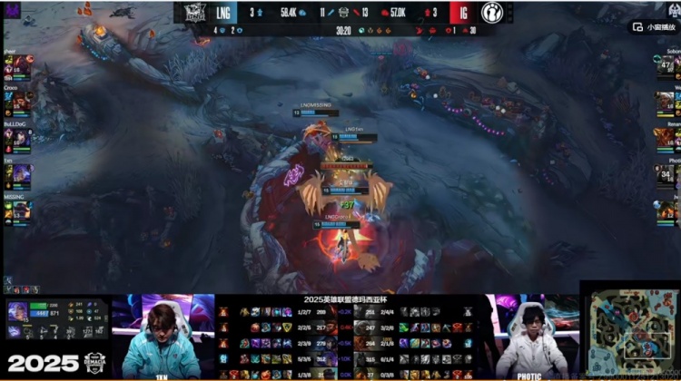 [17:40]小龙团,BuLLDoG阿狸先手魅惑配合Croco猴子开转强杀了Jwei泰坦,但是Soboro莫德凯撒大招点名Croco猴子自己吃伤害还抗了太多时间,正面没人管的Photic维鲁斯输出拉满,回头1V1还反杀掉了1xn芸阿娜!这波最终iG打出3换5团灭LNG,拿下听牌龙!经济反手领先2K!