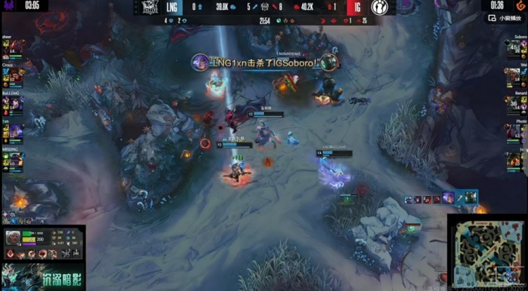 [21:44]iG拿下厄塔汗,侧翼Renard岩雀吃到阿狸魅惑被留,正面sheer塞恩泥头车创到了iG上野,点名留人的Soboro莫德凯撒也被LNG五人集火强杀!这波LNG打出0换2,拆掉了iG的下一塔!