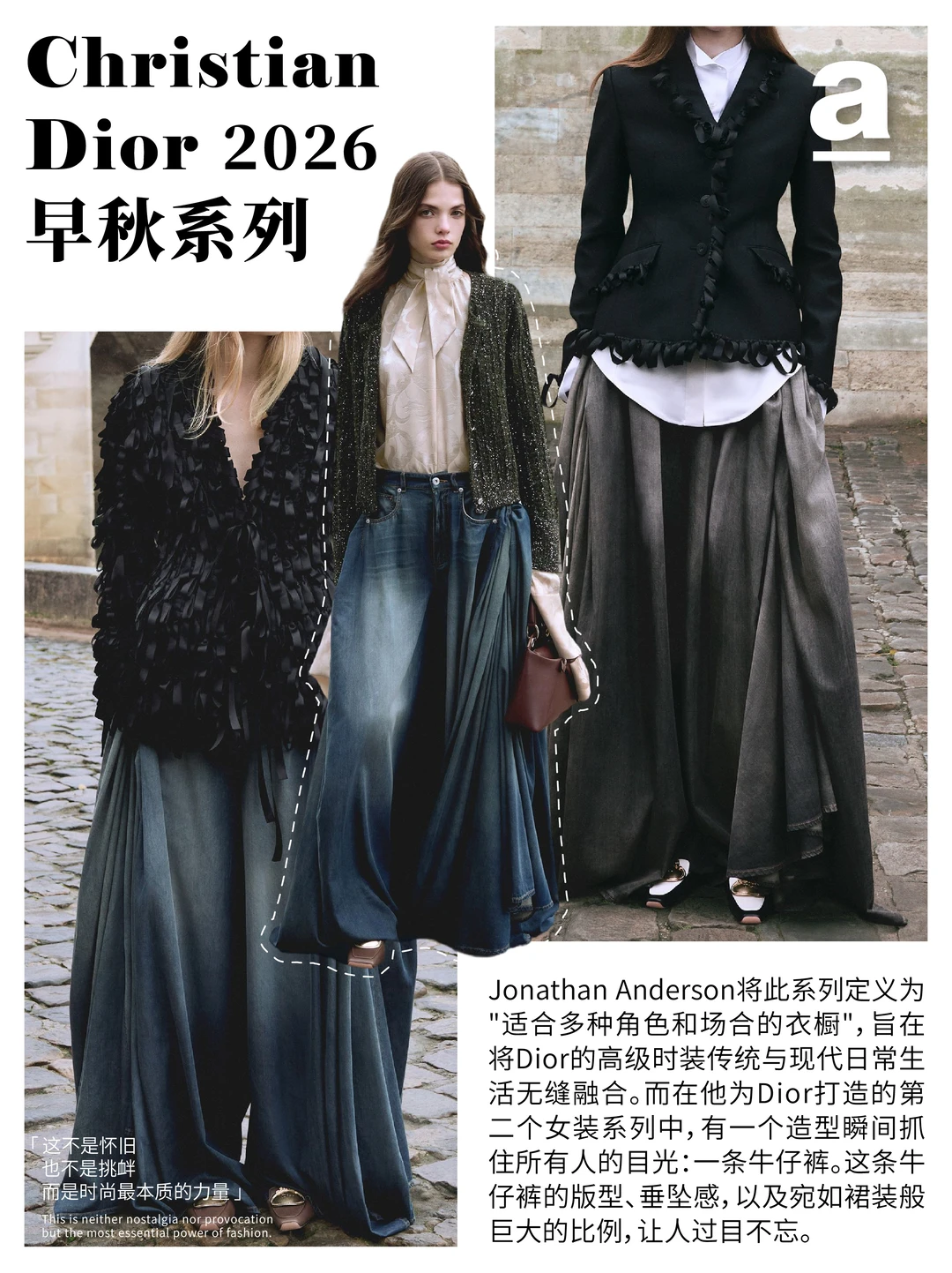 在巴黎塞纳河畔的石砖路上,一件丝巾式垂坠裙装掠过19世纪的铁艺栏杆;凡尔赛宫的鎏金厅室内,丹宁阔腿裤与18世纪的浮雕墙形成奇妙共振 —— 这是 Dior 2026 早秋系列的视觉注脚:以品牌跨越80年的档案为墨,在当代生活的画布上,写就一场“古典与现代的美学对话”。 Jonathan Anderson 说:“风格是一种对话,迅速、多变且极具个人色彩。”Dior 2026 早秋系列的“跨越世纪”,并非让穿着者“回到过去”,而是让经典元素成为现代人的“表达工具”。