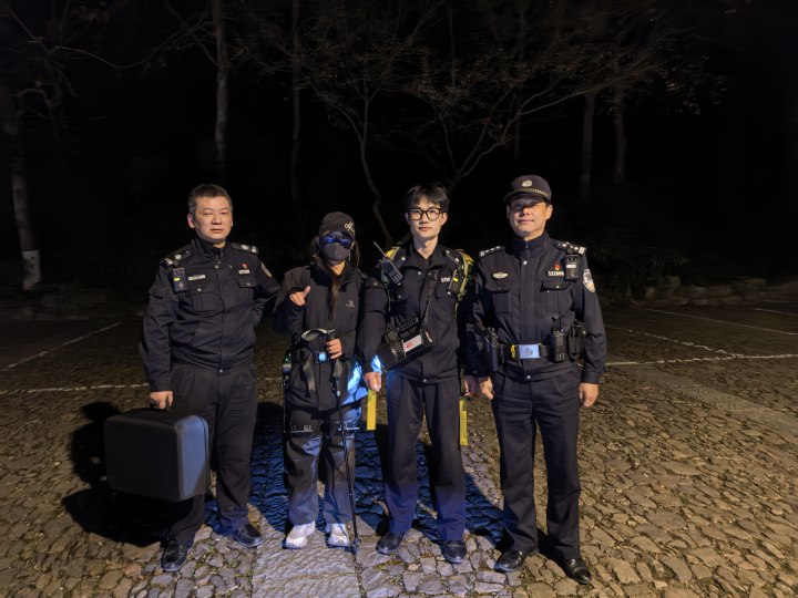 接到报警后,民警邵雄来迅速带着辅警孙健、叶振涛驱车赶往现场。十里琅珰山间岔路纵横交错,植被茂密,搜寻难度极大。于是,辅警叶振涛穿戴上了智能外骨骼装备,向前探路。得益于外骨骼机器人的助力,叶振涛的行进速度大大提升,很快就找到了坐在路边的报警人陈女士。