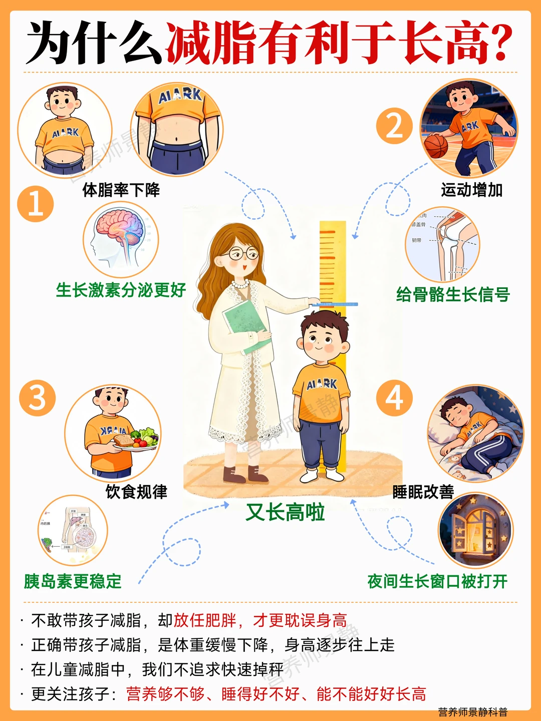 减脂会不会影响长高? 这是家长最该关心的问题新~ . 你好🤝我是营养师景静。 . 在咨询里,家长问我最多的就是: “景静,孩子多久能瘦?” 还有:“孩子现在在长身体,减脂会不会影响长高?” . 这2️⃣个问题,真的问到点子上了。 . ✅先给大家一个明确结论: 👉 科学正确的减脂,不但不会影响长高,反而更有利于长高。 . ⚠️真正影响身高的,是错误的减脂方式,和肥胖给孩子带来的影响。 . 一、为什么你们会担心“减脂会影响长高”? 可能你们认为的减脂是这样的: ❌不吃主食 ❌晚上不吃 ❌饿肚子 ❌这不能吃、那也不能吃🤦‍♂️ . 如果是这种方式 那确实可能影响生长发育。 . 因为孩子长高,跟这几种有关: ✅足够的能量 ✅优质营养 ✅稳定的生长激素分泌 . 吃得太少、营养不均衡, 身体自然没有足够的营养长个子了 . 二、那为什么说“科学减脂”反而更利于长高? 我们带孩子减脂要做的,其实不是“少吃”, 而是吃对食物 ➕动起来 ➕睡好➕良好的情绪 . 很多偏胖的孩子,存在这几个问题: 💡吃得多,但钙、铁、维D、维生素不够 💡睡得晚,生长激素分泌又受影响 💡体重超出范围,胰岛素抵抗,反而抑制生长激素 . ⏰当饮食结构调整好、作息规律后, 身体环境变了,生长激素分泌反而更稳定。 . ⚖️临床和我指导的实际案例里,不少孩子在体脂下降的同时,身高增长速度是加快的。 . 三、真正伤身高的,是这3️⃣种 家长一定要避开👇 ❌ 不吃主食、只吃菜和肉 ❌ 刻意压体重,天天盯秤 ❌ 用成人减肥方法套在孩子身上 . 孩子减脂,目标不应该是降得快, 而是体重缓慢下降,身高逐步增加。 . 四、判断孩子能不能“边减脂边长高” 看这4️⃣点 . 你可以简单对照一下: ✅ 每天三餐规律,有主食 ✅ 蛋白质、蔬菜、水果都有 ✅ 晚上10点入睡 ✅ 有日常运动,而不是剧烈消耗 . 如果这些都能做到, 那咱们完全不用担心“影响长高”。 . 正确的带孩子减脂,是为未来的身高、体型、饮食习惯和代谢打基础。 . 咱们家长一定要稳住,方法用对了,孩子的身体数据会给我们答案。