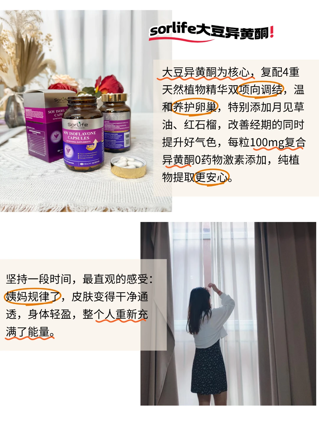 ❷ 补大豆异黄酮:它作为植物䧳激素,能温和调节激素水平,不仅帮助稳定内在环境,还能提升皮肤抗氧力,让肌肤透出平整润弹的光泽,我选择的是sorlife大豆异黄酮,看重它的科学配比,大豆异黄酮为核心,复配4重天然植物精华双项向调结,温和养护卵巢,特别添加月见草油、红石榴,改善经期的同时提升好气色,每粒100mg复合异黄酮0药物激素添加,纯植物提取更安心。