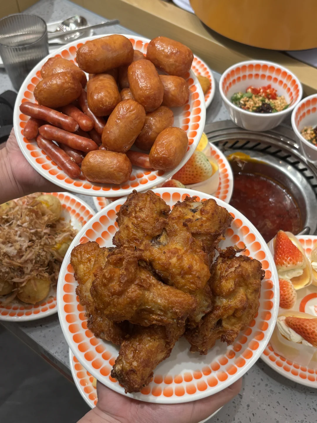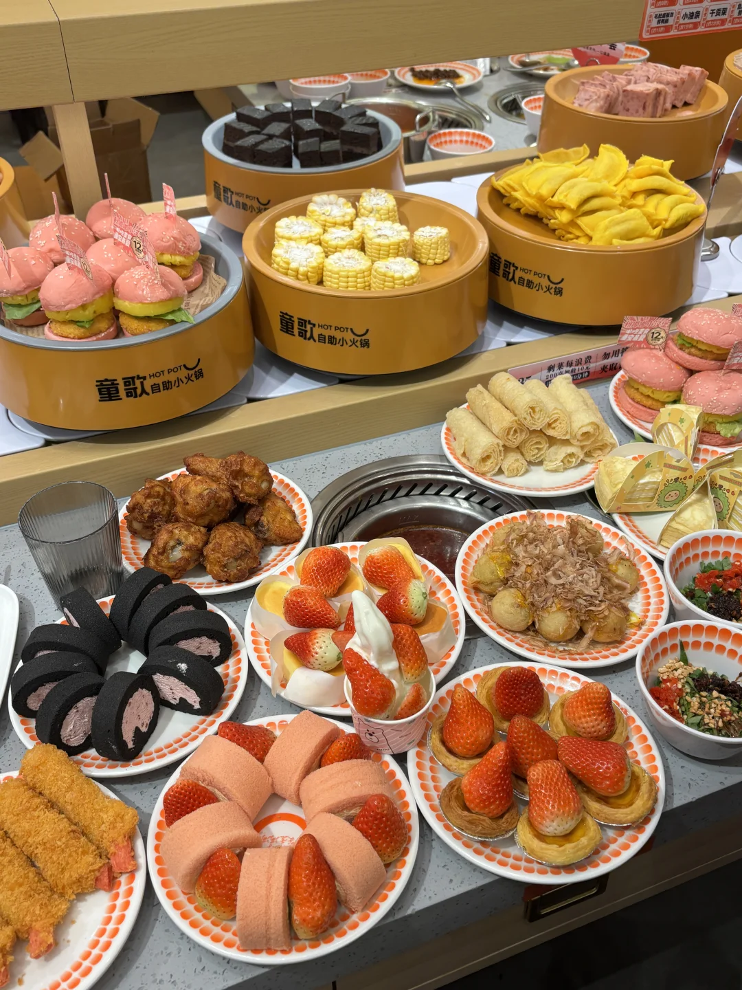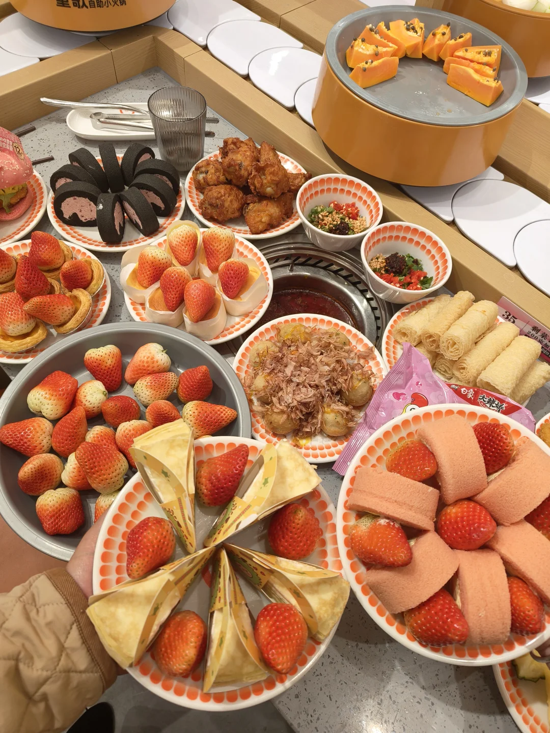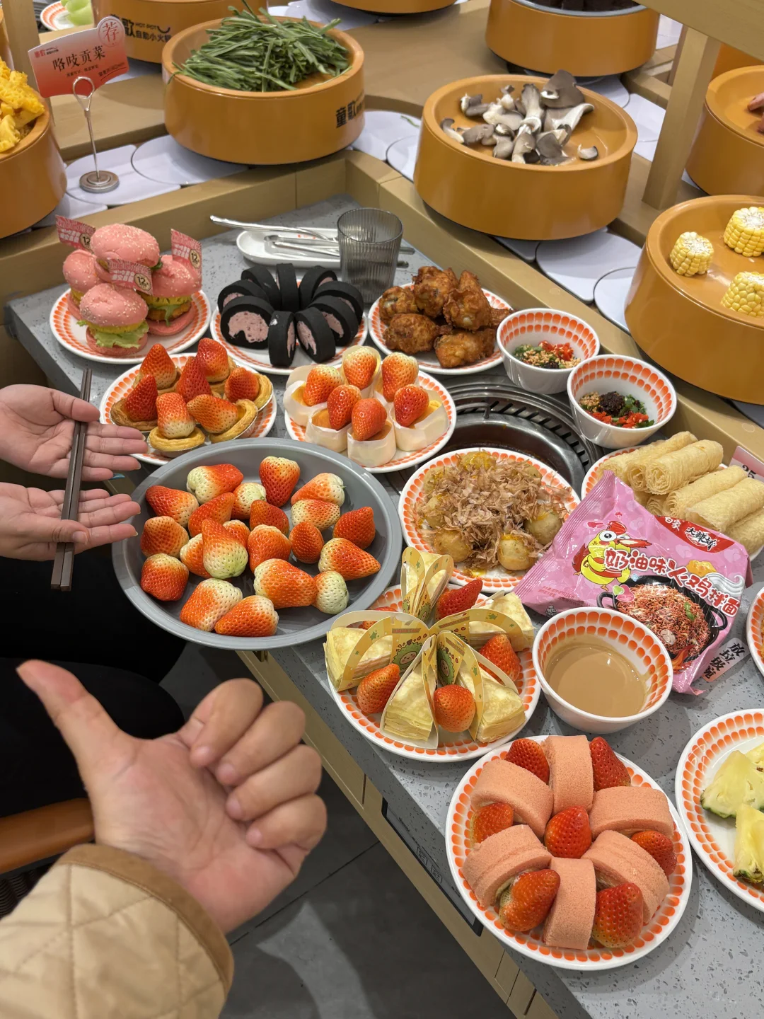 家人们,谁懂啊! 本来只想来炫一顿自助小火锅🥘,结果被草莓🍓季的新品🍰直接拿捏了! 用草莓🍓DIY了草莓蛋挞、草莓榴莲千层、草莓瑞士卷、草莓火鸡面、草莓糖葫芦……草莓脑袋一整个幸福晕了!快乐值直接💯 七种锅底🥘任选!菜品多到扶墙出: 粉嘟嘟小汉堡🍔 招牌肥牛🥩 香辣炸鸡🐔 厚切五花肉🥩、潮汕牛肉丸🫘、广式小香肠🥓、鲜牛蛙🐸、笔管鱿鱼、巴沙鱼、鱼籽福袋🍥……全是不限量的!随便涮! 饮料水果: 饮料🧋随便喝,管够!!!