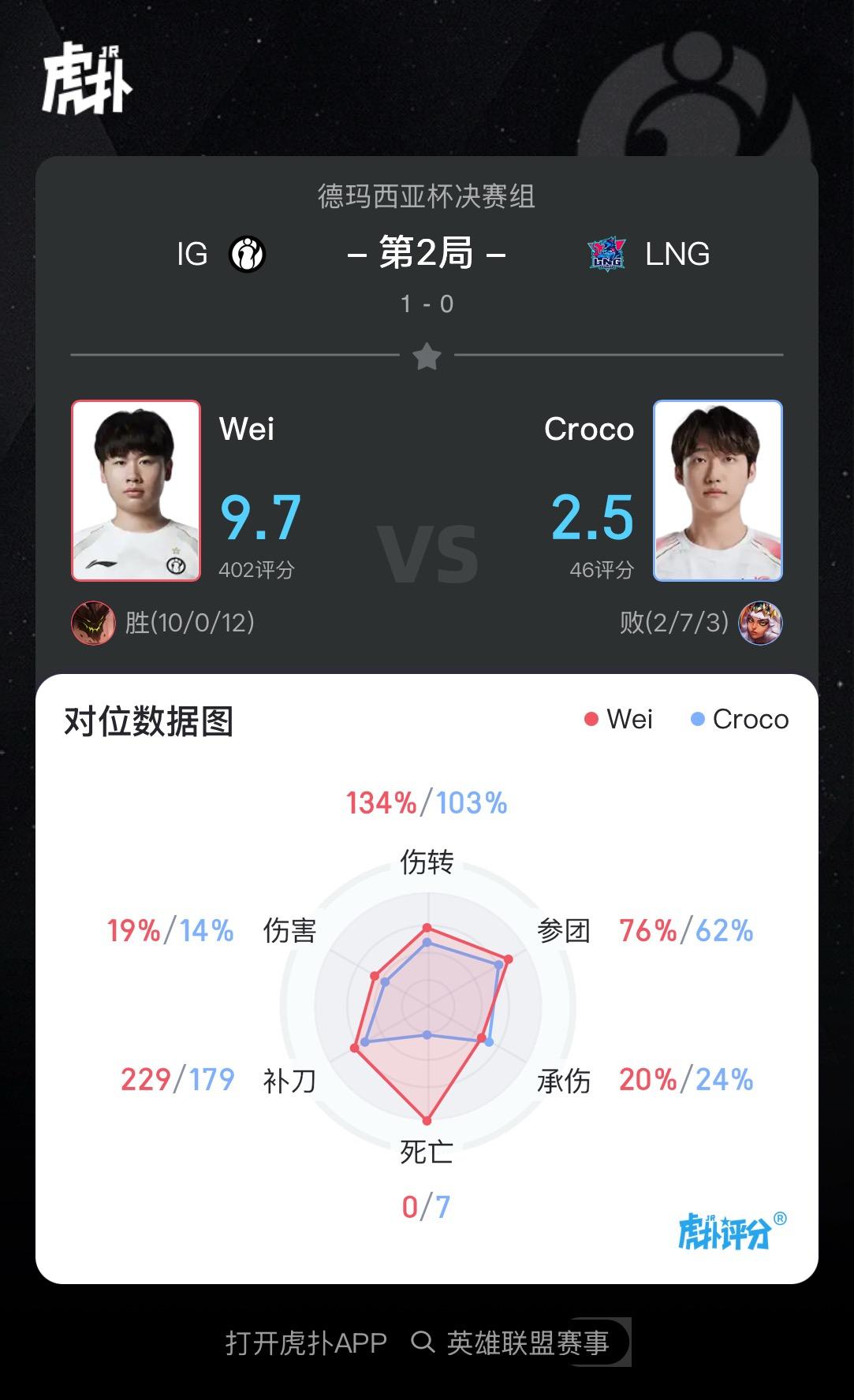 虎扑01月01日讯在刚刚结束的IG对阵LNG的对局中,Wei使用石头人打出10/0/12战绩,斩获LNG对阵IG第二局MVP