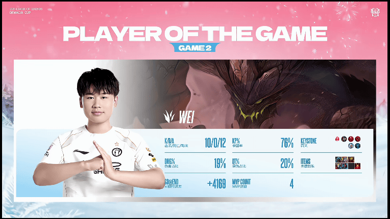 Wei使用石头人打出10/0/12战绩,斩获LNG对阵IG第二局MVP