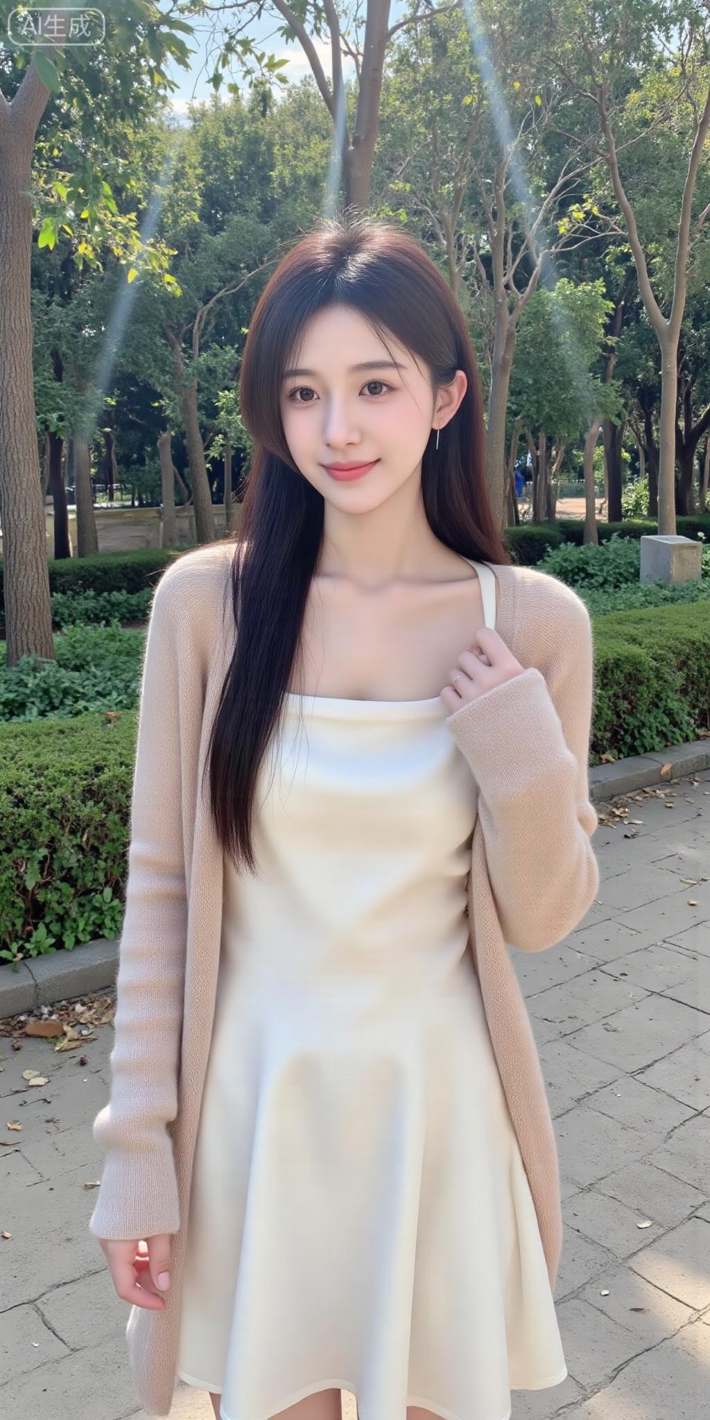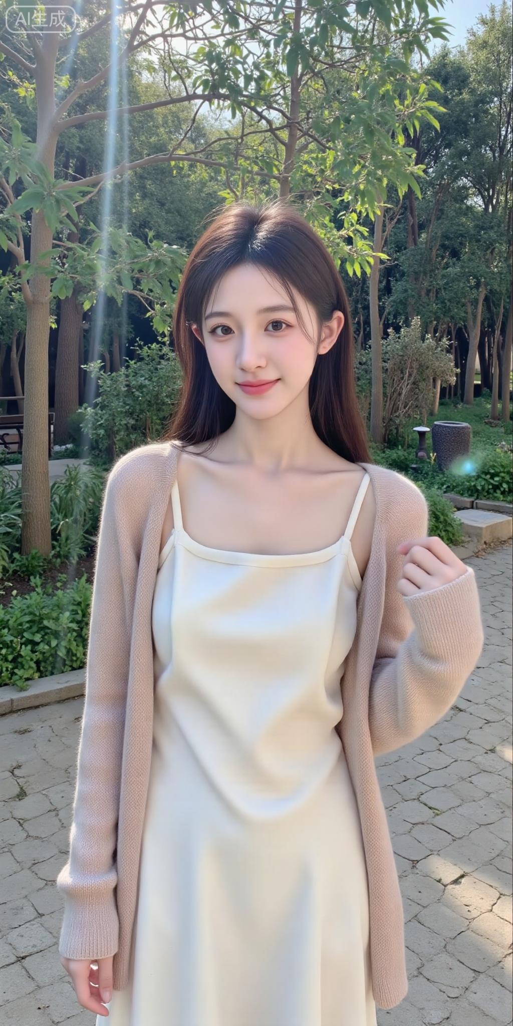 林荫下的柔暖甜妹好治愈 奶杏开衫裹着缎面白吊带,软乎乎像抱了团阳光,抬手遮眉