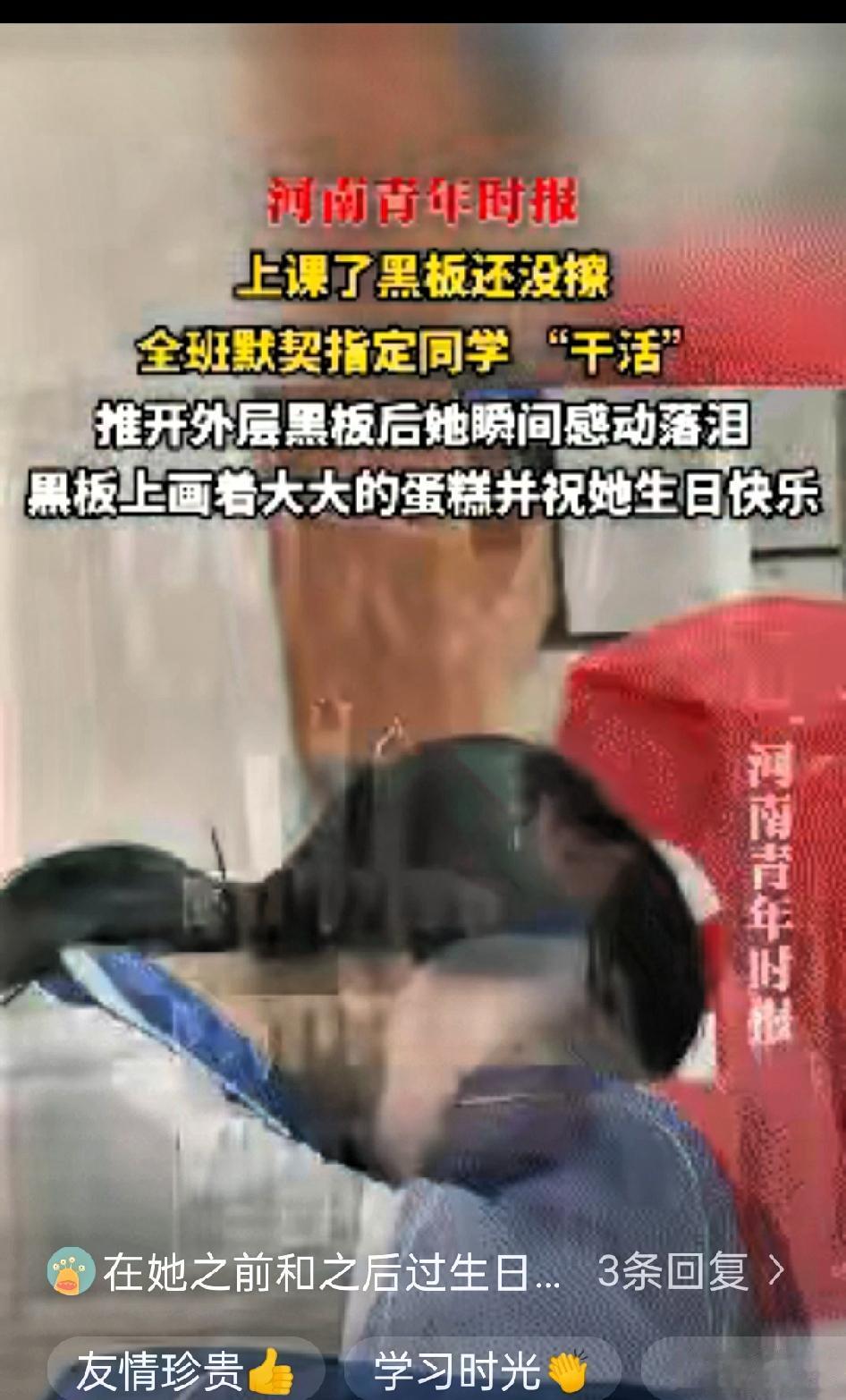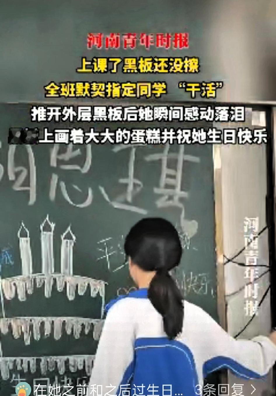 太暖心了!近日广东东莞,老师上课时发现黑板还没擦便问今天谁值日,没想到全班同学异口同声喊出一个女生的名字 女生当场愣住——自己根本不是今天的值日生。看着大家起哄的样子,她又委屈又气愤,却还是拿起黑板擦默默擦拭,心里满是不解:平时相处融洽的同学,怎么会突然这样“欺负”自己。 更让她疑惑的是,擦完一块黑板想离开时,同学们又纷纷喊住她,让她把另一块也擦干净。 带着一肚子的委屈,她拉开了另一块黑板,下一秒瞬间红了眼眶。黑板上画着可爱的生日蛋糕,还写满了同学们的暖心祝福,原来这天是她的17岁生日,同学们早就串通好老师,精心策划了这场“暖心骗局”。 女生蹲在地上,把头埋进胳膊里偷偷抹泪,几个要好的女同学立刻上前抱住她,帮她擦拭眼角的泪水。 紧接着,全班同学唱起了生日快乐歌,歌声不算整齐,甚至还有点跑调,却成了她听过最动人的旋律。 这年头总有人说人情淡薄,但这份校园里的同学情,却纯粹得能治愈所有不开心。没有昂贵的礼物,没有盛大的排场,只是一群少年,用最真诚的方式,把好朋友放在心上。 多年后,女生或许会忘记课本上的公式定理,忘记考试的紧张焦虑,但一定会记得,在17岁的课堂上,曾被全班同学偷偷惦记的感动。这份不掺任何杂质的善意,才是青春最珍贵的宝藏。
