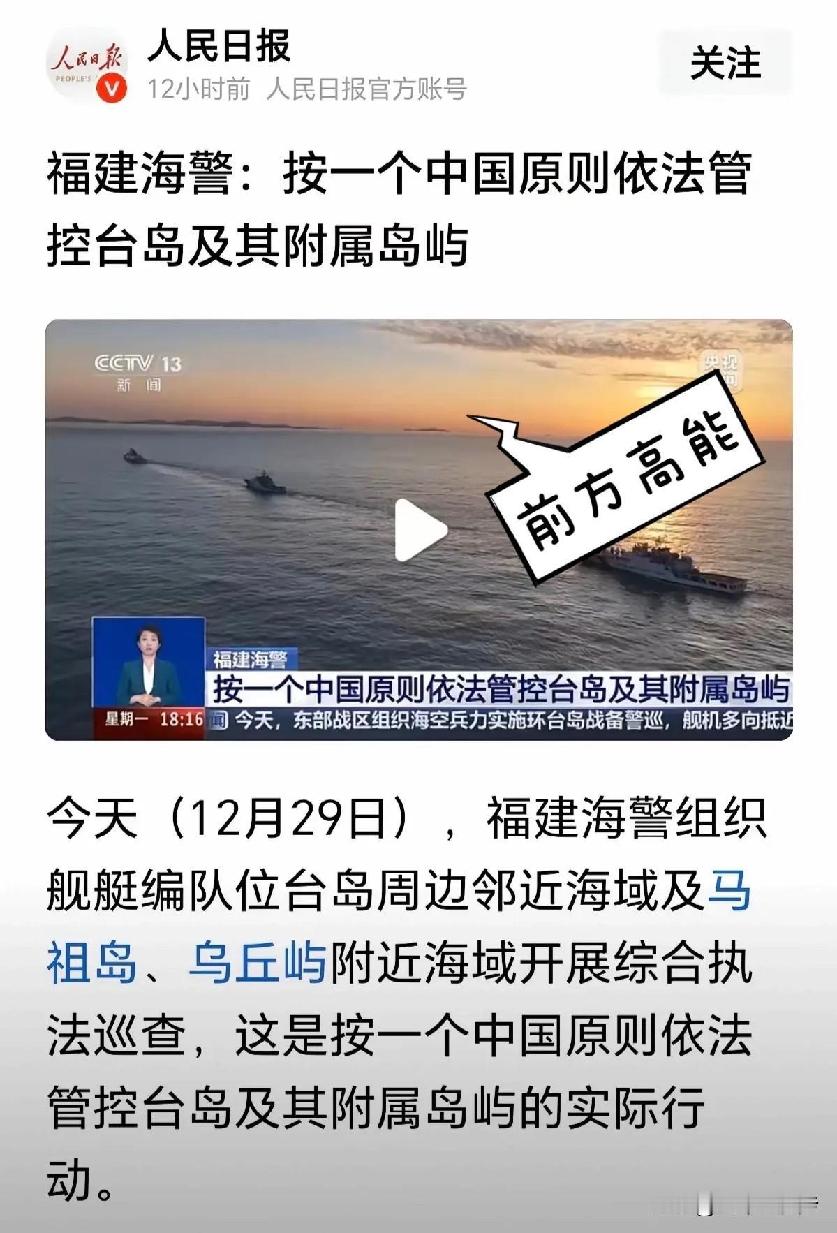 演习结束后,福建海警还会按照一个中国原则依法管控台岛及其周边海域吗? 答:演习结束后,福建海警将继续依据一个中国原则,对台岛及其周边海域实施常态化依法管控,坚定捍卫国家主权领土完整,维护台海海域秩序与和平稳定。 海警巡航台湾岛 海警台湾岛执法