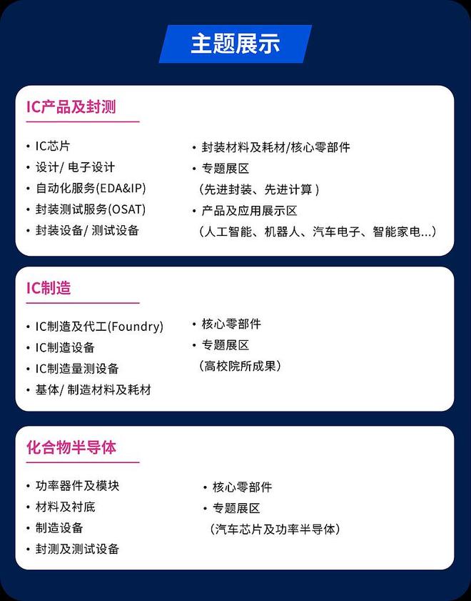 同时也将进一步强化在半导体制造领域的深度展示与资源对接,展示晶圆制造及代工、封装测试服务、半导体设备、半导体材料、化合物半导体、半导体核心零部件等核心制造环节的前沿技术与产品,持续服务半导体制造产业发展。