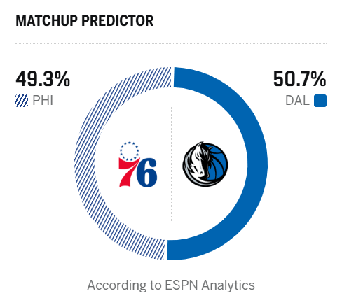 ESPN预测明日比赛:独行侠胜率50.7%,76人胜率49.3%