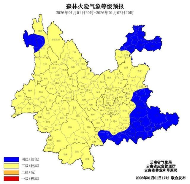 1月1日20时至1月2日20时,迪庆州、怒江州中部和南部、丽江市、大理州、德宏州、保山市、临沧市、普洱市、西双版纳州、楚雄州、昆明市、玉溪市、昭通市南部、曲靖市北部和中部、红河州北部和中部三级,其他地区四级。