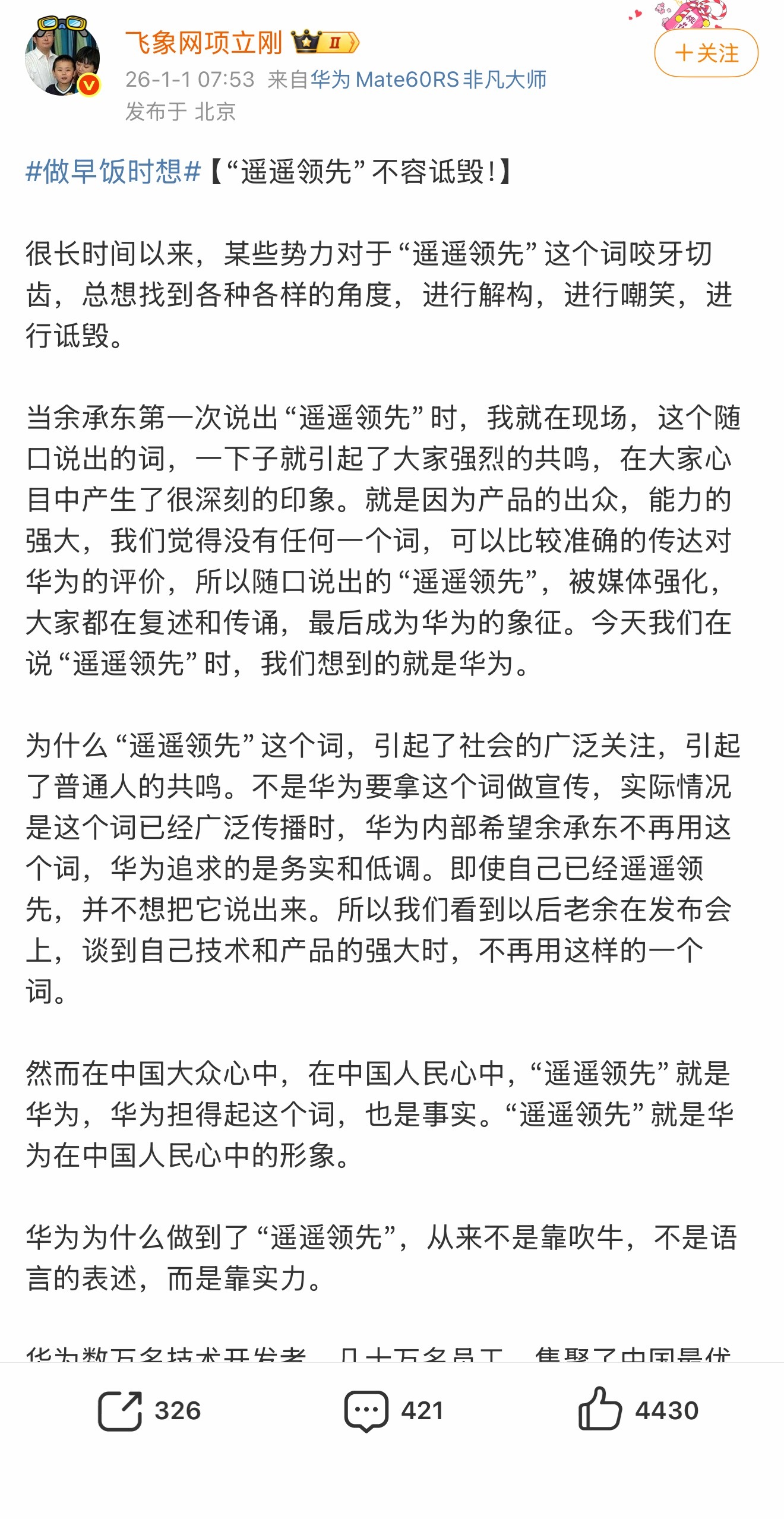 老罗嘲笑华为遥遥领先,项立刚不忍了,新年第一天就反击。项立刚的千字长文,字