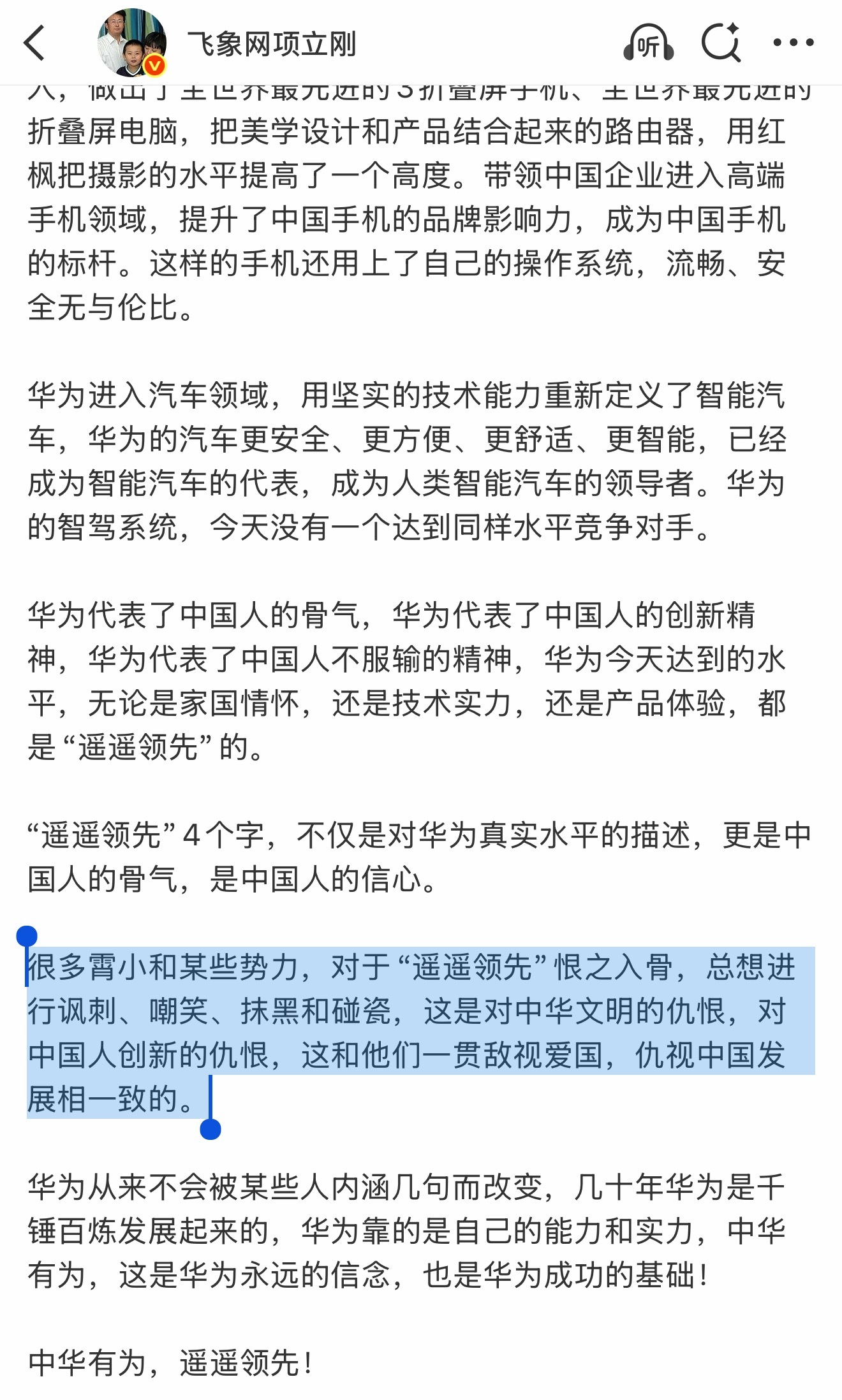 项立刚再批罗永浩:很多霄小和某些势力,对于“遥遥领先”恨之入骨,总想进行讽刺、嘲笑、抹黑和碰瓷,这是对中华文明的仇恨,对中国人创新的仇恨,这和他们一贯敌视爱国,仇视中国发展相一致的。