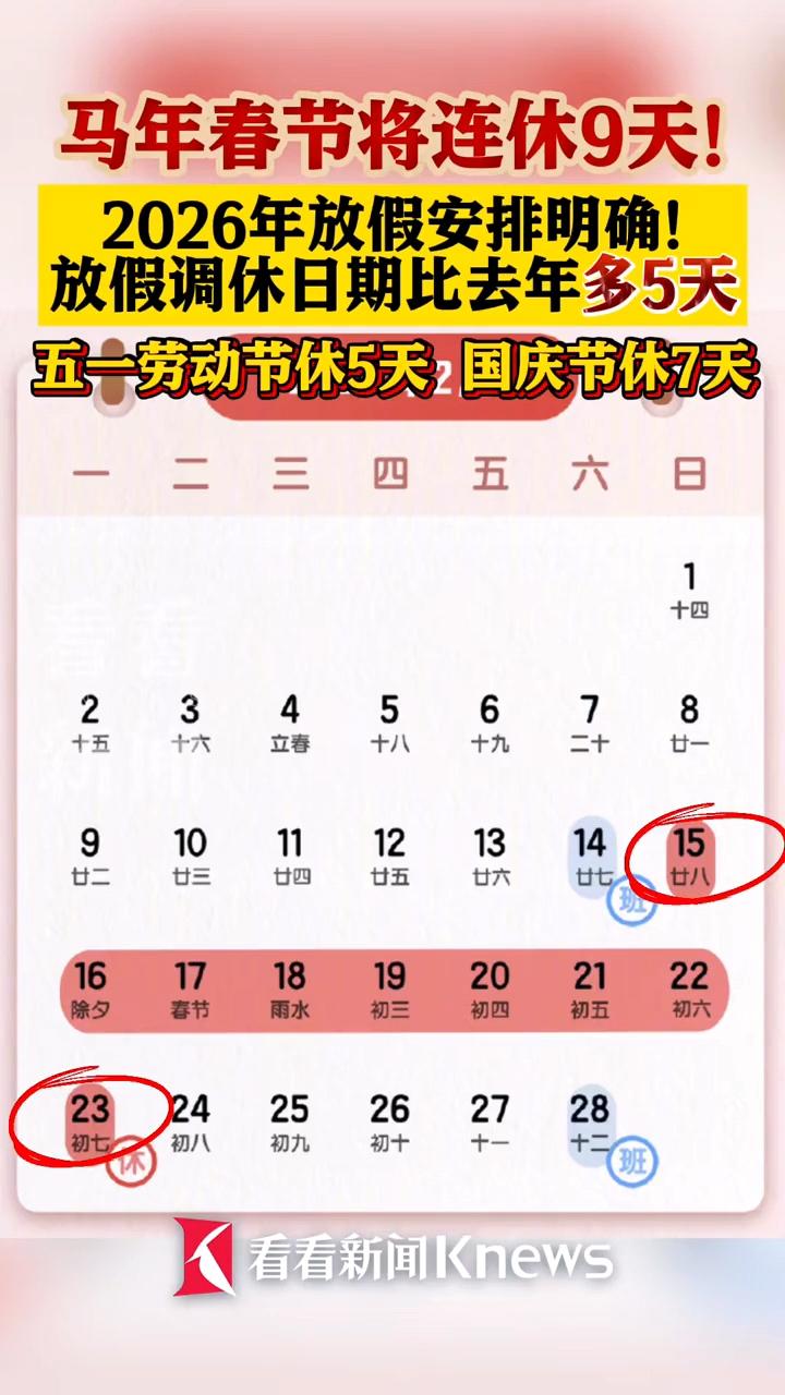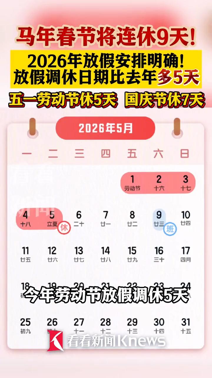 这真的是打工人的好消息啊! 2026年的法定假期,比2025年多了整整5天!