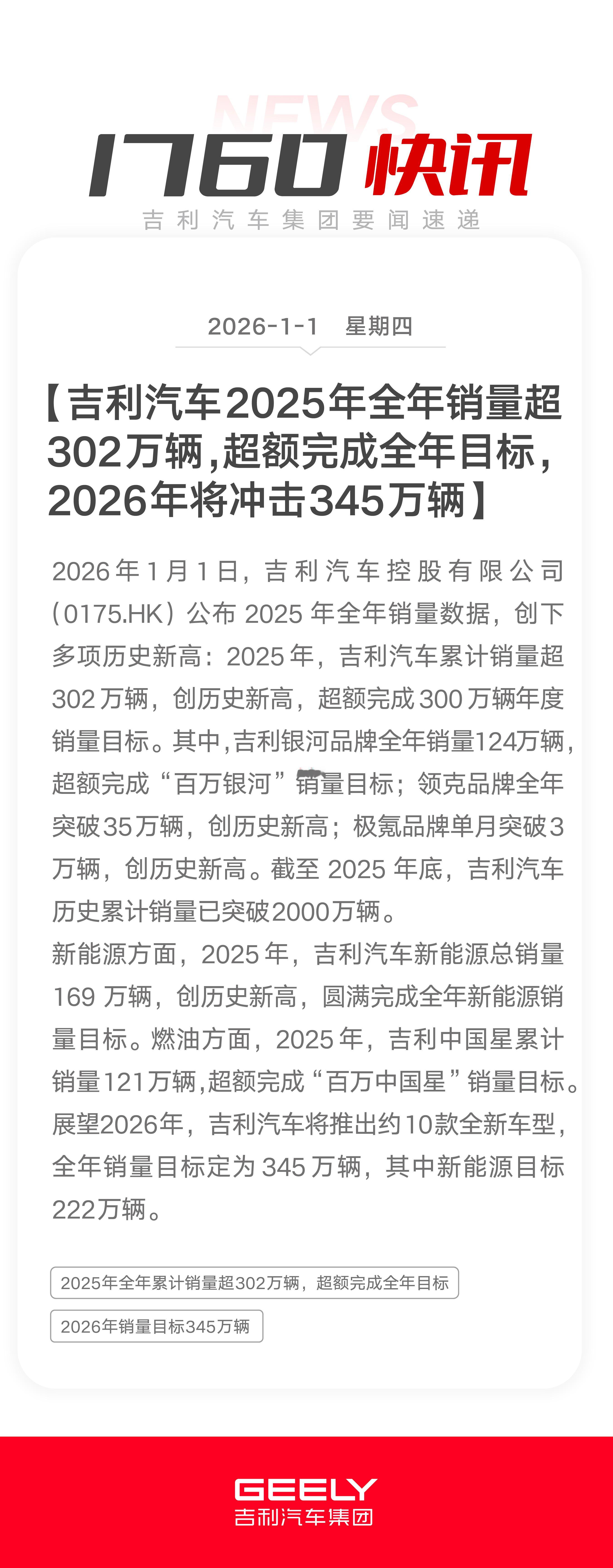吉利2025年的战绩还是很猛。全年目标300万辆,最终销量超302万,超额完成全年销量目标。其中新能源汽车销量169万辆,占比55%。2026年把目标拉到了345万辆,其中新能源销量目标222万辆。新能源销量目标占据了吉利汽车总目标的三分之二左右,说明吉利明年的资源权重应该还是倾斜到了新能源。我觉得这是未来的目标,也是未来的方向。吉利汽车全年销量超302万辆超额完成目标吉利汽车2026年销量目标345万辆