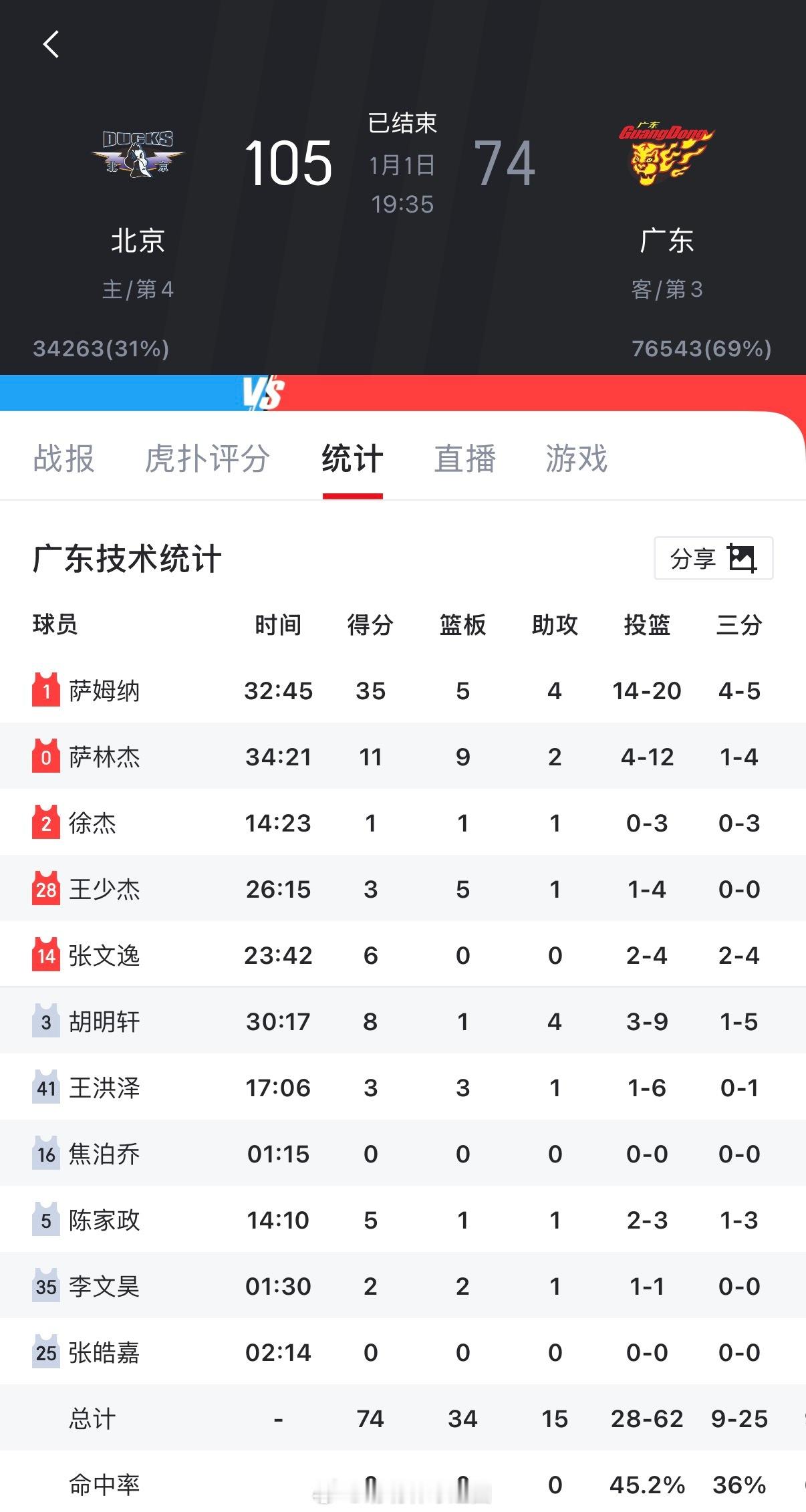 胡明轩北京男篮vs广东男篮 🏀CBA联赛25-26赛季常规赛第9轮⛹️ 全场比赛结束 广东东阳光 74 🆚 105 北京北汽赛后复盘 及时调整 准备四连客末战数据方面:🐯胡明轩8分1篮板3助攻3抢断1盖帽 萨林杰11分9篮板 萨姆纳35分5篮板4助攻 王少杰3分5篮板 王洪泽3分3篮板 陈家政5分1篮板 张文逸6分 李文昊2分2篮板下一场:1月3日 广东vs北控(客场)记得收看哟~ 📺
