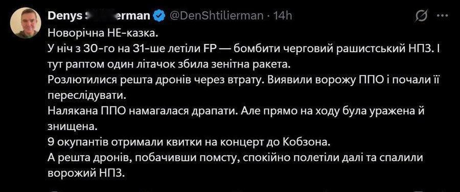Fire Point 的共同所有人和首席设计师的新年惊喜。 “12月30日至31日,一群FP无人机奉命袭击俄罗斯一家炼油厂。其中一架被击落,其余无人机随即展开反击,发现了防空系统,并将其追击摧毁。九名俄罗斯士兵丧生。剩余的无人机完成了任务,将炼油厂焚毁,”