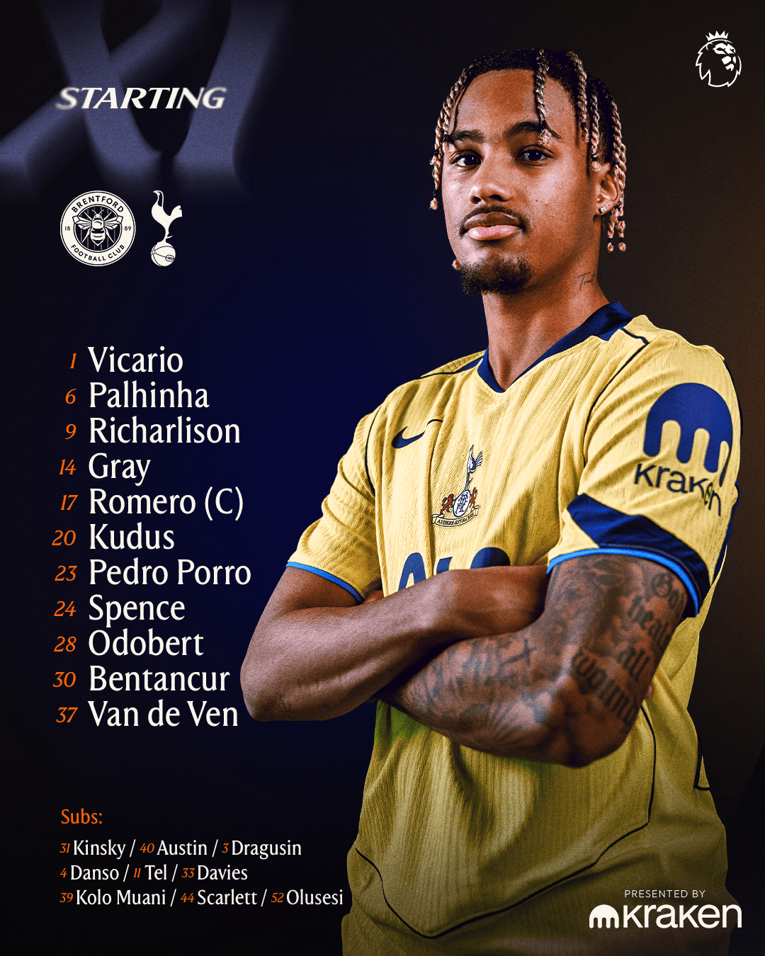 热刺首发:1-维卡里奥、23-波罗、17-罗梅罗、37-范德芬、24-斯彭斯、30-本坦库尔、6-帕利尼亚、14-阿奇-格雷、20-库杜斯、9-里沙利松、28-奥多贝尔