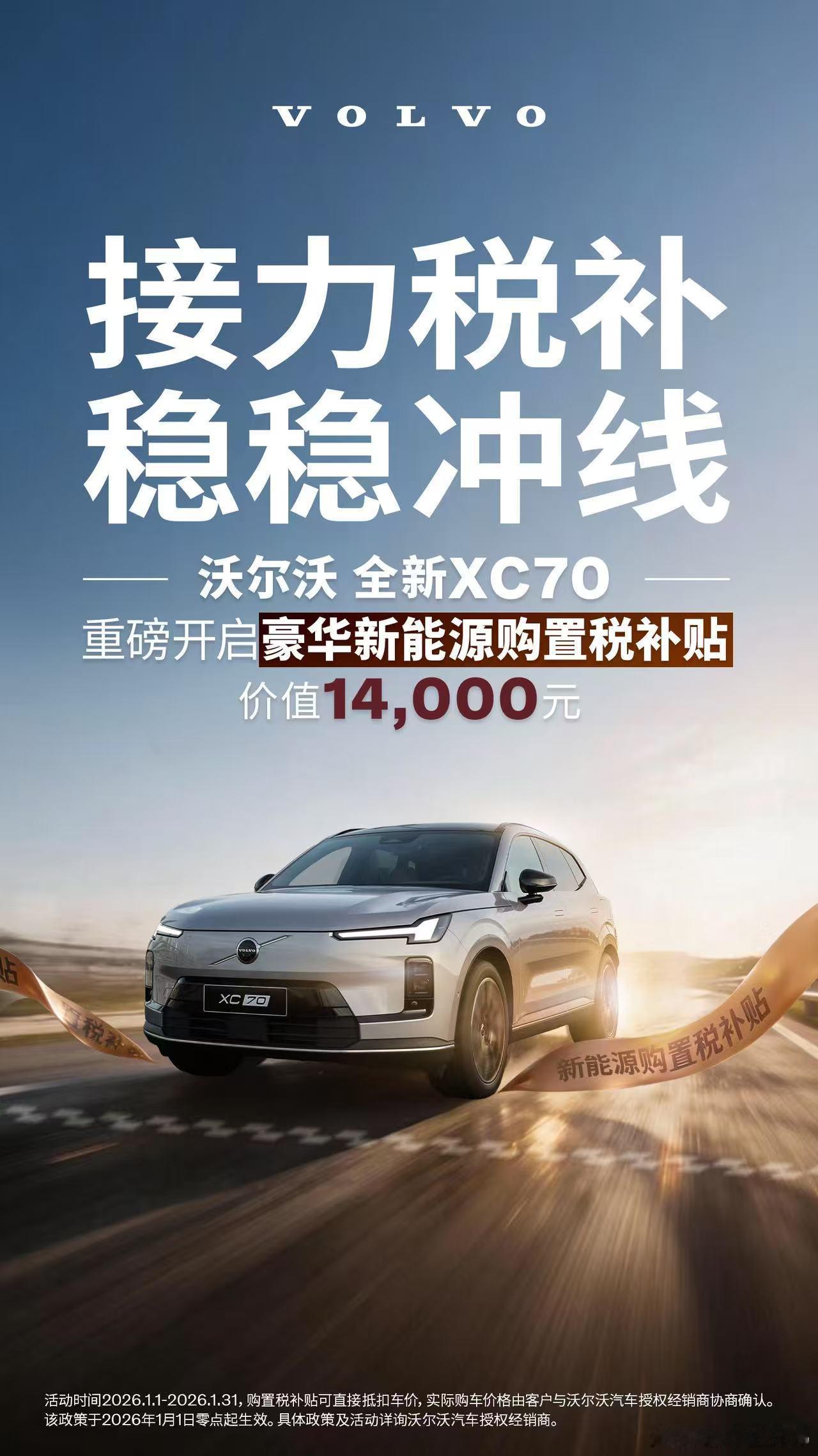 沃尔沃新年首推新能源购置补贴2026年新能源购置税从3万减到1.5万,各大车企也都给出了应对措施,譬如沃尔沃XC70直接砸出1.4万补贴,相当于把优惠力度拉回了之前的水平,让消费者不再纠结,可以放心选车。