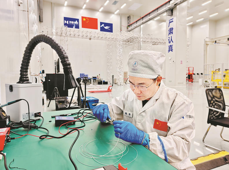 1月1日,蓝箭鸿擎(雄安)空间科技有限公司的厂房内,工程师正在为“雄安一号”卫星进行热实施电缆焊接。张佳旺摄