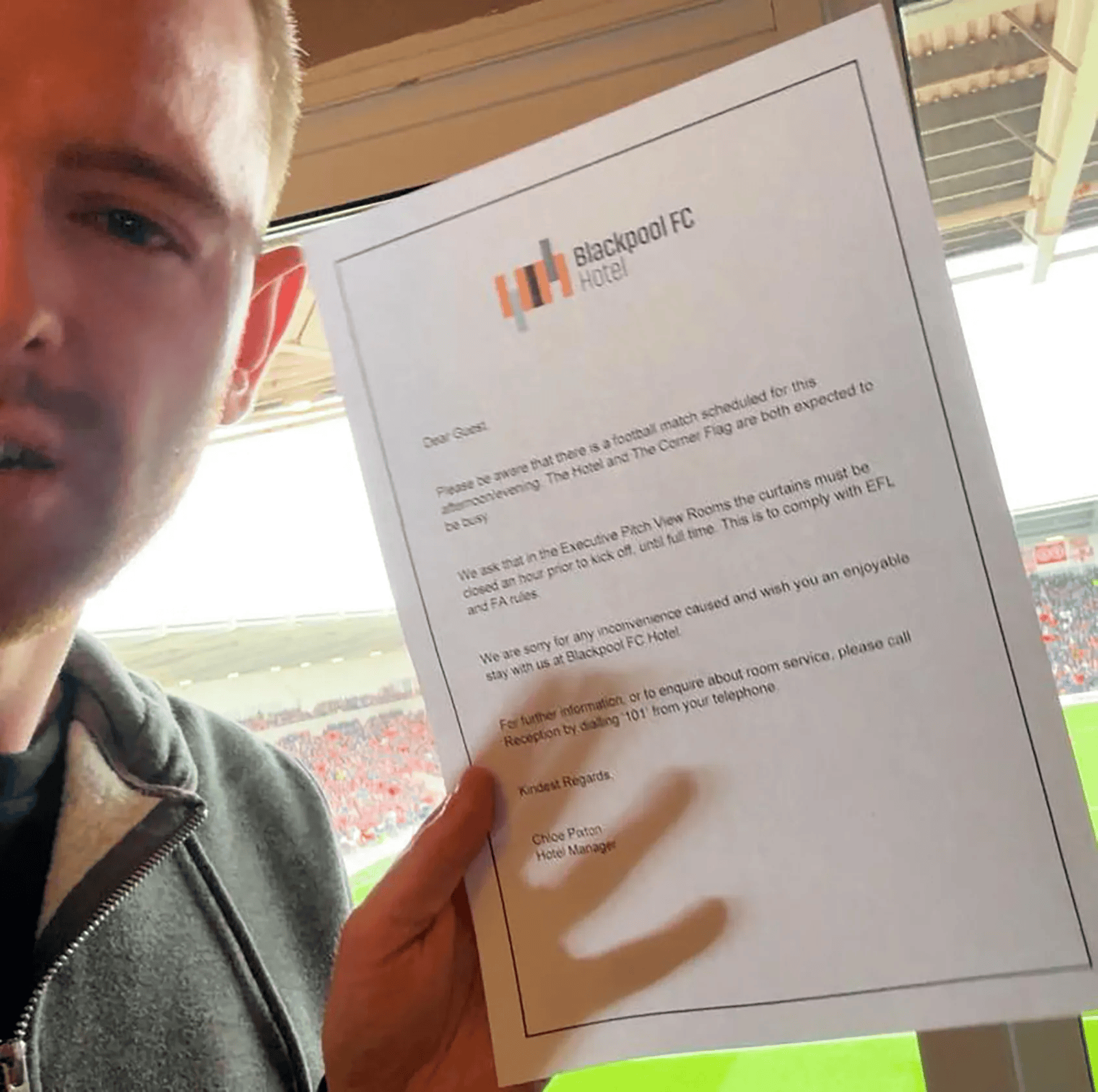 DarrenDowling和DavidHandling本就迟到了,最后他们只能隔着紧锁的观赛套房窗户,听着球场内球迷的呐喊声。之后,他们才看到布莱克浦足球俱乐部球场酒店老板克洛伊-帕克斯顿出具的一份说明函。函件中写明,为遵守英格兰足球联赛与英格兰足总的相关规定,客房窗帘必须从开球前一小时起,直至全场比赛结束全程保持关闭状态。