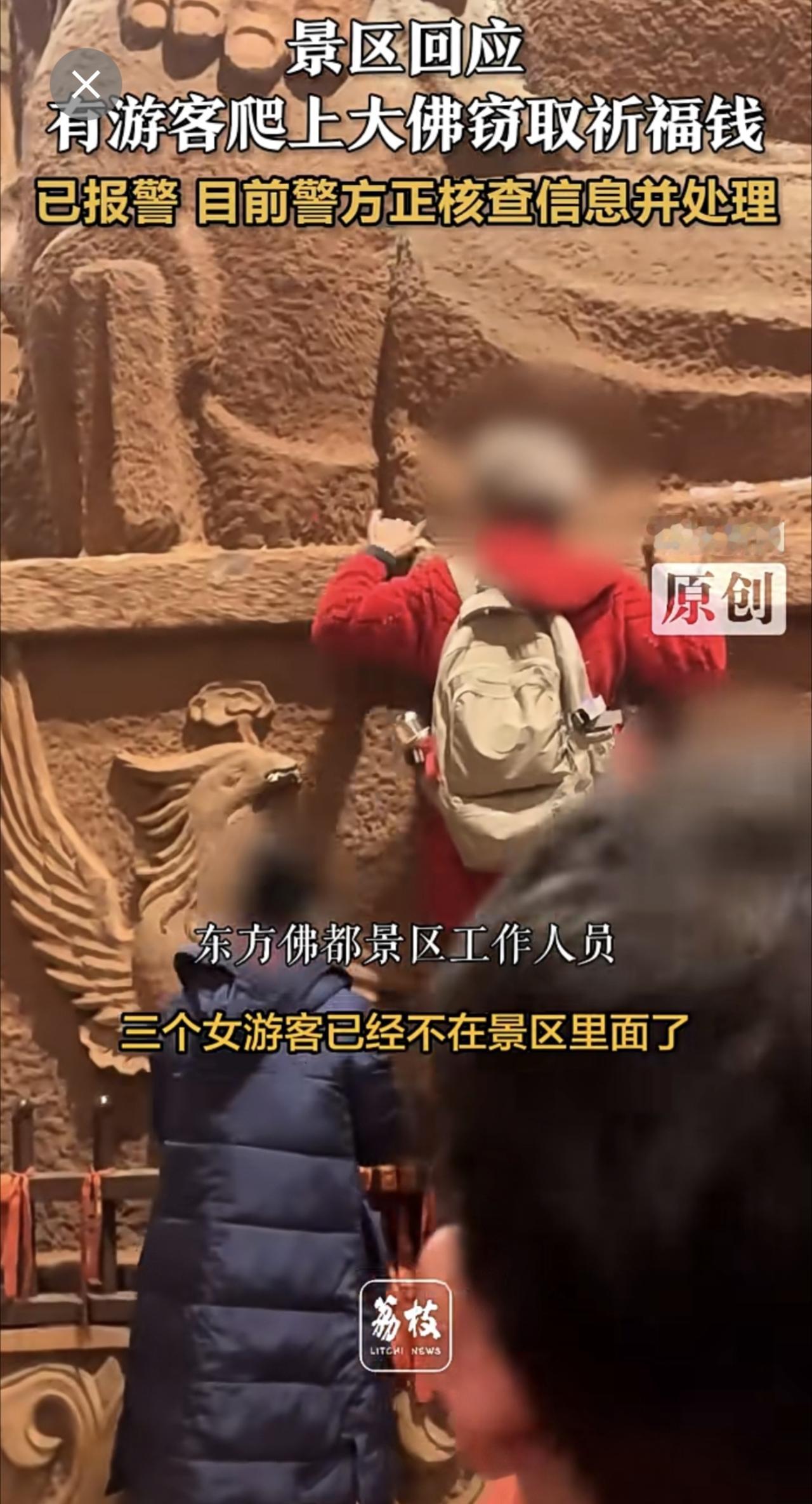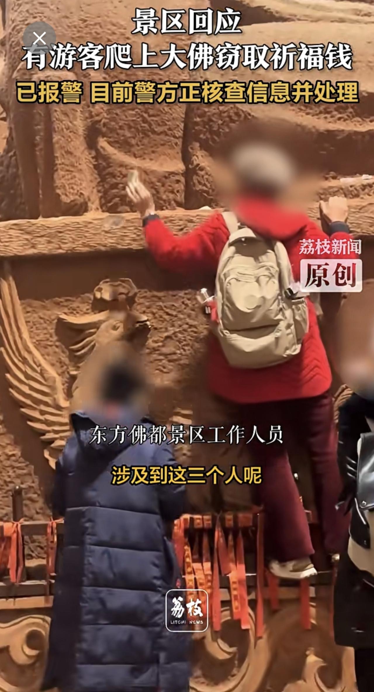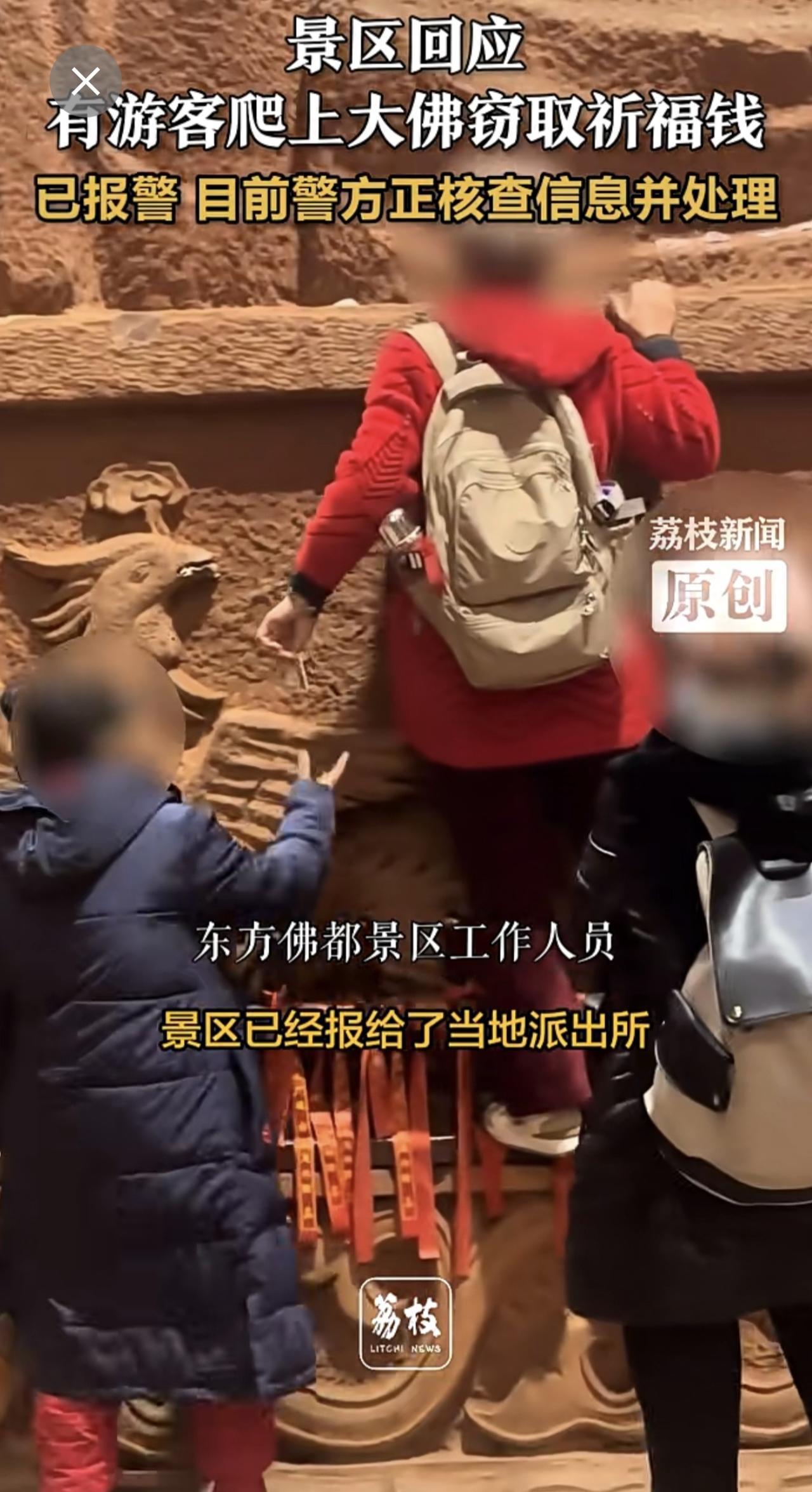 景区回应有游客爬上大佛窃取祈福钱 :已报警 目前警方正核查信息并处理
