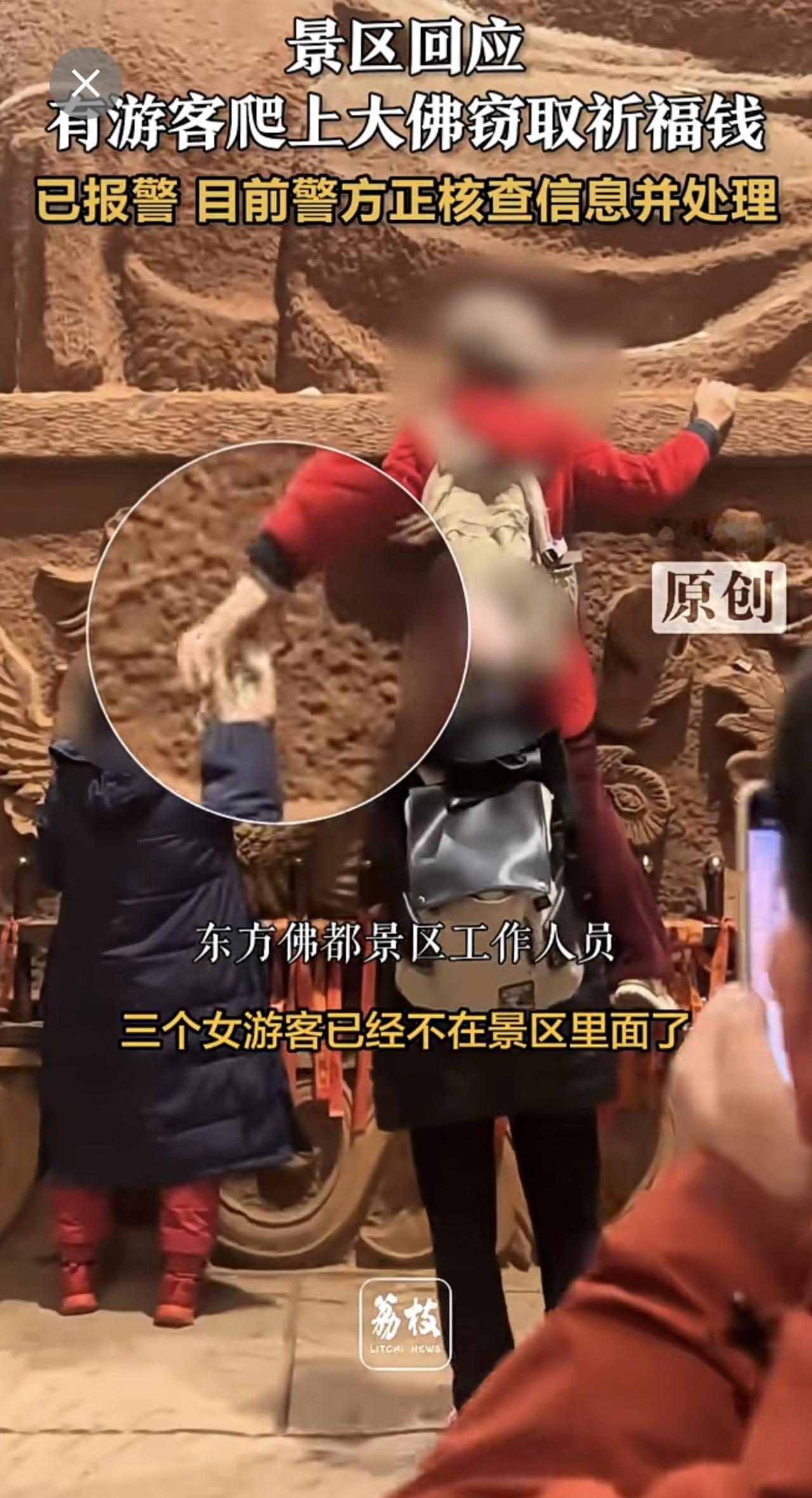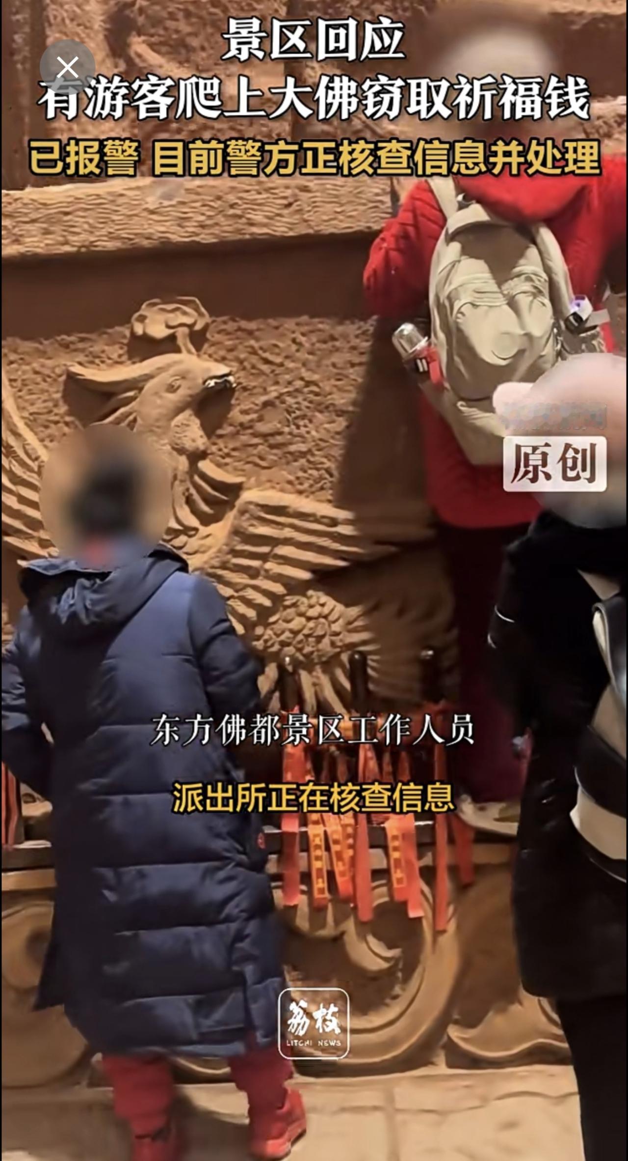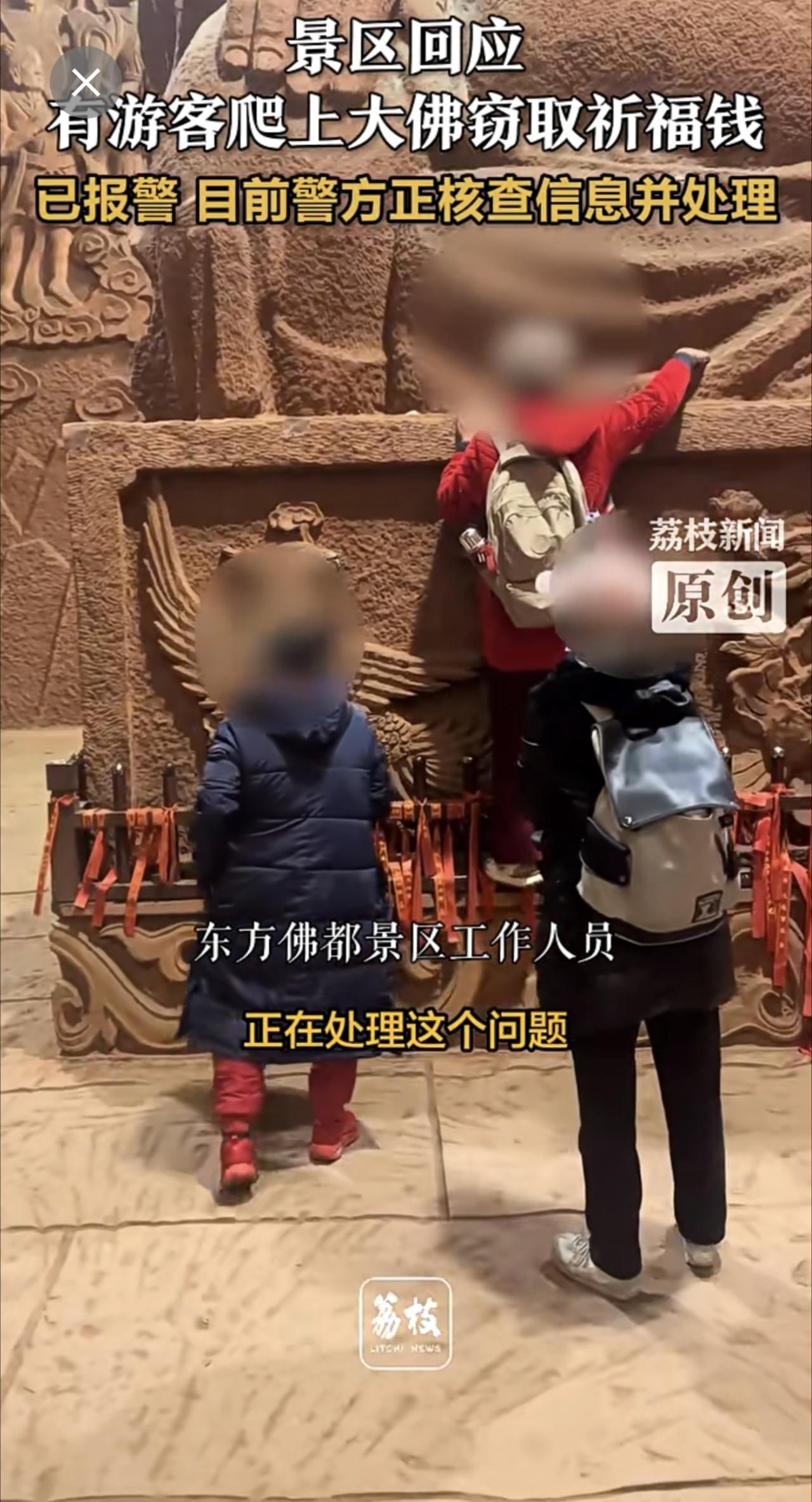 景区回应有游客爬上大佛窃取祈福钱 :已报警 目前警方正核查信息并处理