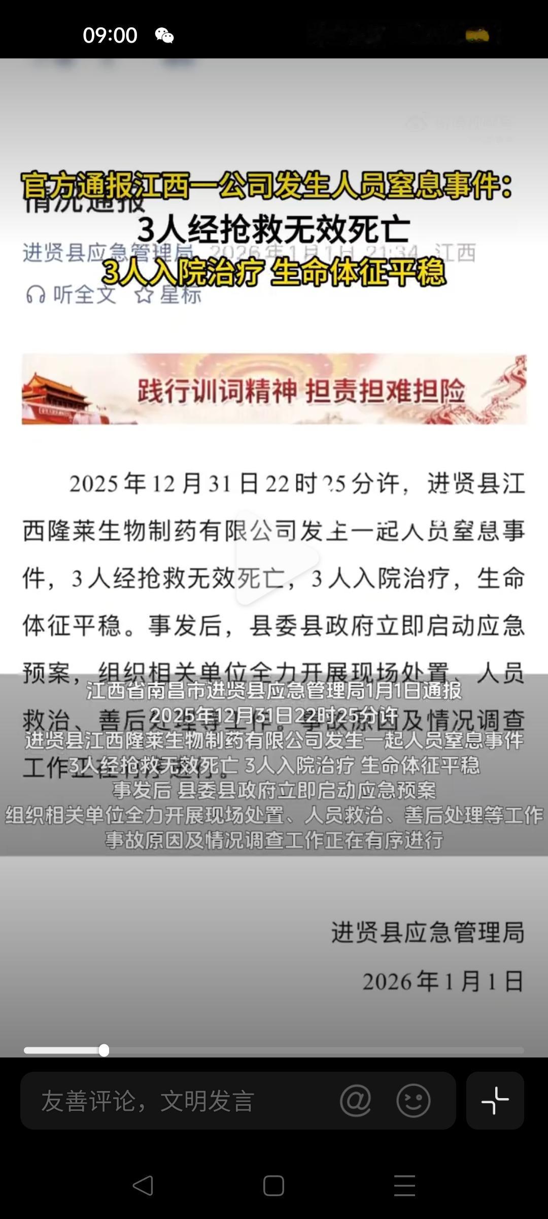 悲剧敲响安全警钟:企业生产,生命至上! 今日热推 家人们,当跨年的钟声在耳畔欢快敲响,沉浸在辞旧迎新喜悦中的我们,很难想象,在江西南昌进贤县的一家公司,一场令人痛心疾首的悲剧正在上演。2025年12月31日22时25分,江西隆莱生物制药有限公司发生人员窒息事件,3条鲜活的生命就此消逝,另外3人虽暂时脱离生命危险,但这起事故无疑给多个家庭带来了沉重的打击。 从人性的角度看,我们每个人都是家庭的顶梁柱,是家人心中的依靠。每一个逝去的生命背后,都有父母的悲痛欲绝、伴侣的肝肠寸断、孩子的孤苦无依。而这一切,本是可以避免的悲剧。这起事故也反映出部分企业在安全生产方面存在严重的漏洞和疏忽。为了追求利益最大化,却忽视了员工的生命安全,这无疑是本末倒置。 好在事发后,县委县政府迅速反应,启动应急预案,全力开展救援和善后工作。然而,再多的补救措施,也换不回逝去的生命。这起事件为所有企业敲响了警钟,安全生产绝不是一句空话,必须落到实处。 在企业发展的道路上,我们究竟该如何平衡经济效益和安全生产?你身边的企业是否也存在类似的安全隐患呢?欢迎在评论区留言,一起为安全生产发声!社会百态 社会新闻 生命安全警示