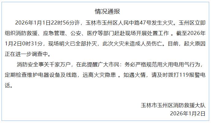 央视网消息:据玉州发布,玉林市玉州区消防救援大队1月2日通报,2026年1月1日22时56分许,玉林市玉州区人民中路47号发生火灾。玉州区立即组织消防救援、应急管理、公安、医疗等部门赶赴现场开展处置工作。截至2026年1月2日0时31分,现场明火已全部扑灭,此次火灾未造成人员伤亡。目前,起火原因正在进一步调查中。