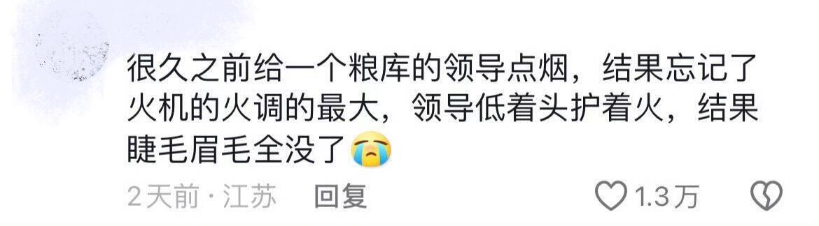 很久之前给一个粮库的领导点烟,结果忘记了火机的火调的最大,领导低着头护着火,结果睫毛眉毛全没了