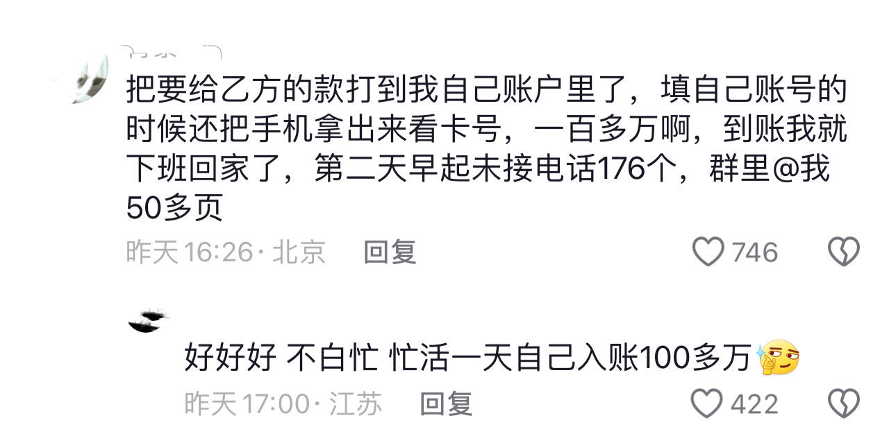 把要给乙方的款打到我自己账户里了,填自己账号的时候还把手机拿出来看卡号,一百多万啊,到账我就下班回家了,第二天早起未接电话176个