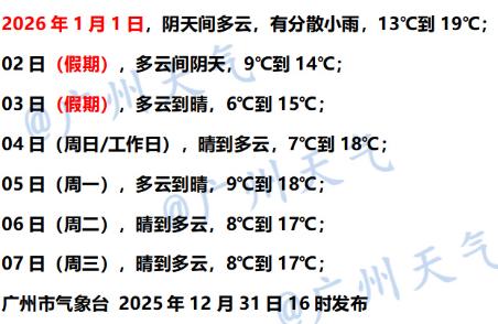 广州市气象台预计,元旦假期(1月1日—3日)广州受较强冷空气影响,前期云量增多并伴分散小雨,中后期渐转天晴,最高气温下降至14℃左右,最低气温将出现在1月3日早晨:北部3~5℃(山区-2~1℃,局部有霜/冰冻),中部5~7℃,南部7~9℃;陆地阵风将加大至5~7级,港区和高地阵风7~9级。1月4日起总体维持晴朗干燥天气,气温小幅波动。