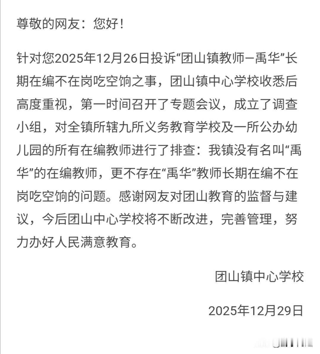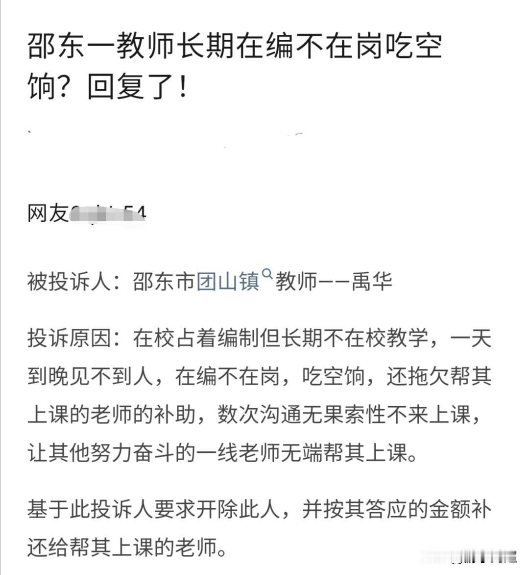近日,有人投诉邵东市团山镇一名教师长期在编不在岗,吃空饷。 投诉人指名道姓指出该教师经常不在学校授课,还拖欠其他老师帮其上课的补助费用。多次沟通无果后,该教师便长期缺勤,投诉者对事情经过的描述还挺详尽。 团山镇中心学校获悉情况后,迅速成立调查专案小组,对全镇在编教师展开排查。结果发现,全镇在编教师名单中根本没有被投诉这名教师的名字。 不知这位投诉人是否是在“恶作剧”,无端浪费社会资源。