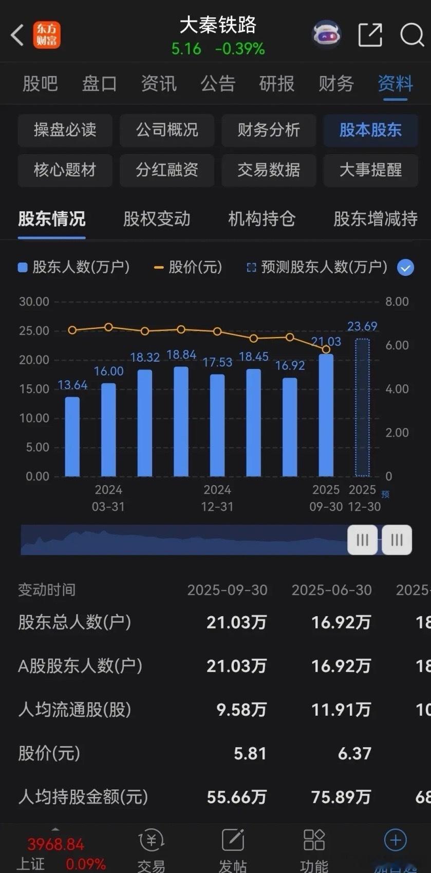 真是不明白了,大秦铁路这走势典型的下降通道,为什么还有那么多股民拼了命地往里冲,好像怕买不到似的。从今年7月份以来,大秦铁路一路单边下跌不回头,股价不断见新低,目前已经下跌了23%,而且走势跌破各条均线,完全是破位的状态。再一个公司的股东人数,6月底是16.92万人,现在已经高达23.69万人,半年时间又增加了近7万人,显然这7万人都是捡便宜的,都以为抄到了大底,结果全部被套,主力不把这些股东洗的秃噜皮了才怪呢!所以大秦铁路何时进场,需要满足两个条件:一、股东人数减少,最少在20%以上,散户忍受不了割肉的时候,才有希望。二、再次放量下杀,来个深蹲,然后k线走平后,10日线上穿20日线形成金叉,才能介入。否则都是肉包子打狗,有去无回,来一个套一个!