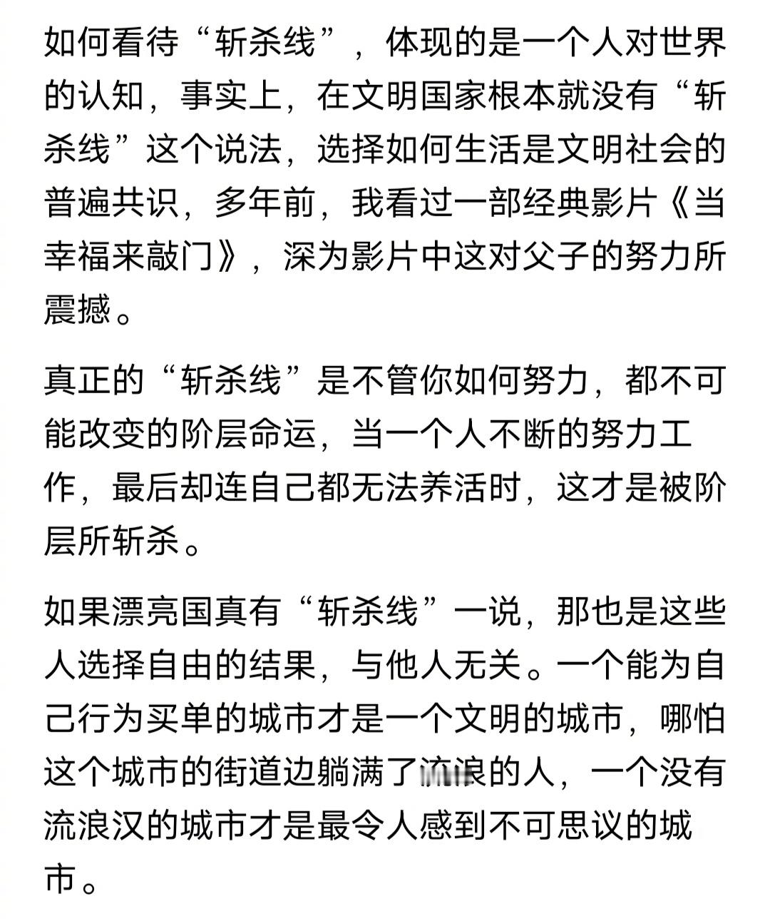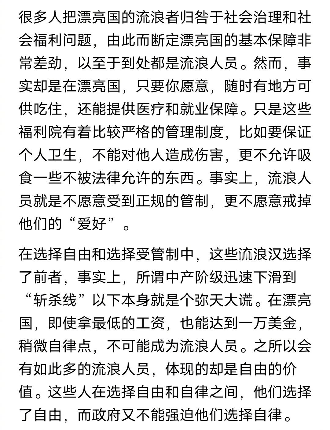 有位网友说:“斩杀线”是一个社会文明的标志。看标题,我原本以为他是讽刺,没想到,他是认真的。这位网友说:在美国,只要你愿意,随时有地方可供吃住,还能提供医疗和就业保障。只是这些福利院有着比较严格的管理制度,比如要保证个人卫生,不能对他人造成伤害,更不允许吸食一些不被法律允许的东西。事实上,流浪人员就是不愿意受到正规的管制,更不愿意戒掉他们的“爱好”。在选择自由和选择受管制中,这些流浪汉选择了前者,事实上,所谓中产阶级迅速下滑到“斩杀线”以下本身就是个弥天大谎。在美国,即使拿最低的工资,也能达到一万美金,稍微自律点,不可能成为流浪人员。之所以会有如此多的流浪人员,体现的却是自由的价值。这些人在选择自由和自律之间,他们选择了自由,而政府又不能强迫他们选择自律。既然这位网友这么说,那就祝福美国更“文明”吧。
