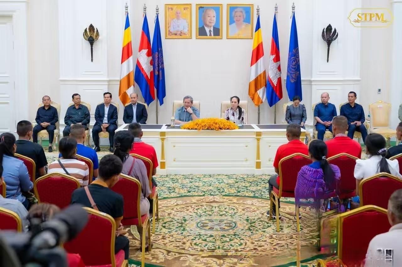 洪玛奈和妻子接见之前被泰国扣押了155天的18名柬埔寨士兵和家属。从现场可以看到,洪玛奈一脸和蔼、手托下巴,身穿警务便装,端坐台上,身边坐着曾经呼吁泰柬和平而哽咽的妻子。洪玛奈的弟弟洪玛尼则坐在左手边,他负责柬埔寨的青年工作,之前也组织柬埔寨的青年在金边游行呼吁和平。现场最显眼的是,墙上挂着西哈莫尼国王和他父母的肖像。