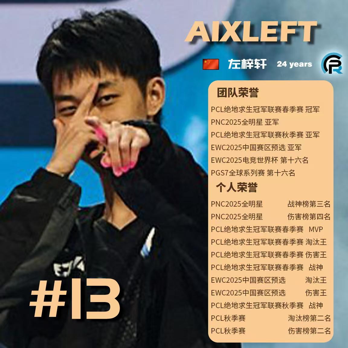 虎扑01月02日讯2025PUBG年度TOP20选手第13名:Pero-Aixleft