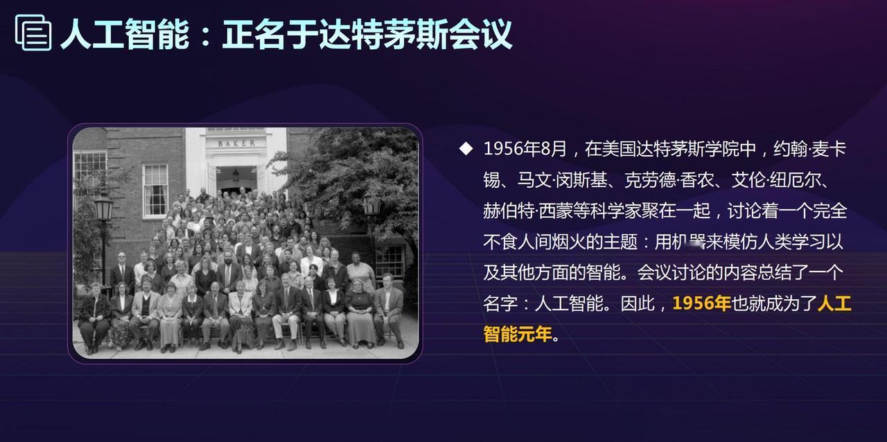大家不用着急,我也是最近学习了很多纪录片之后才弄清楚。 首先,“人工智能”一词是1956年的达特茅斯会议首次提出,人工智能作为一门学科的正式诞生。 《探寻人工智能》等纪录片均有讲述这一历史事件,这是“历史起点”的人工智能元年。