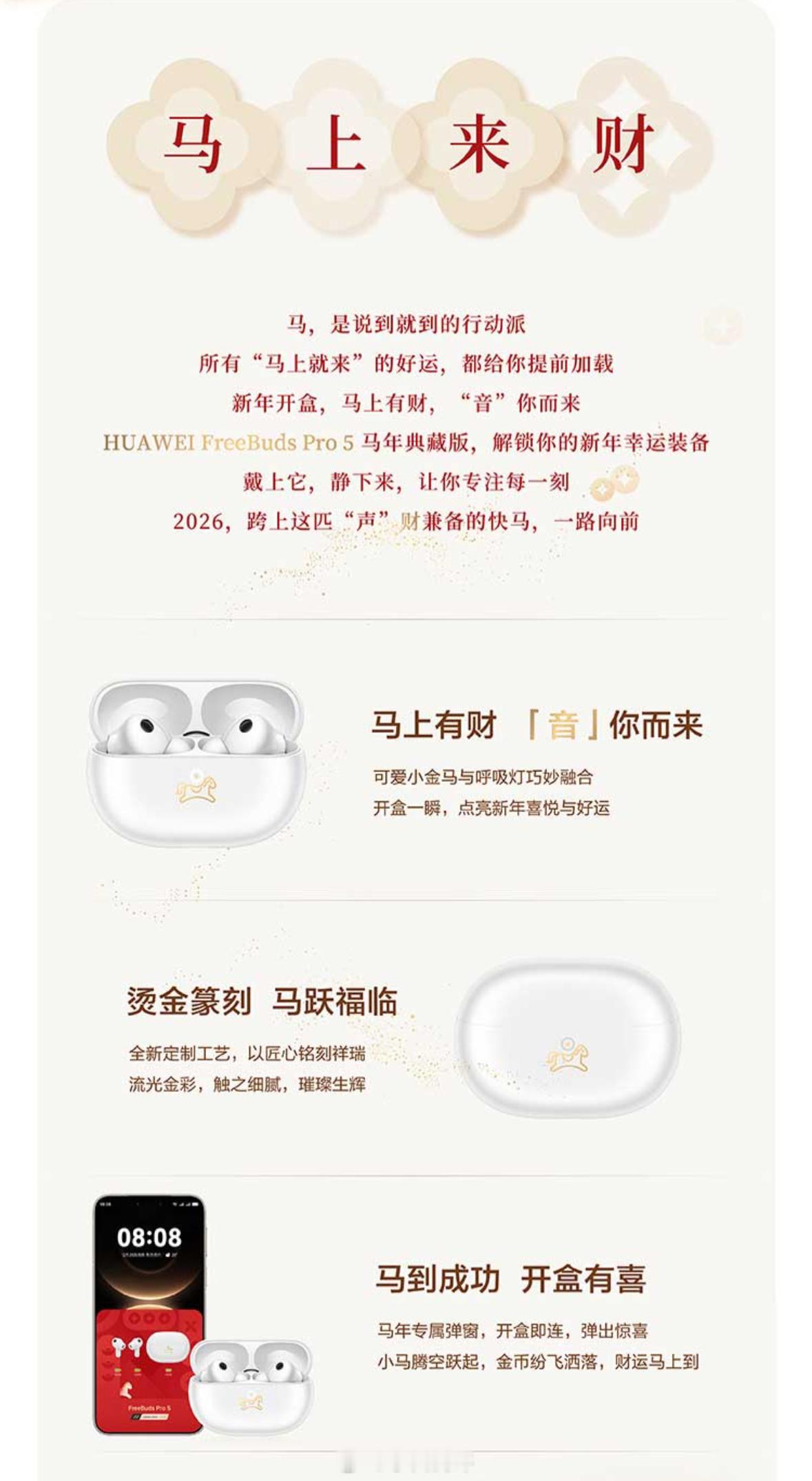 华为FreeBuds Pro 5上了个马年典藏版多了生肖元素的镌刻图案,还有专属动画,马上来财、马跃福临、马到成功,价格和普通版一样。大家平时新年买东西会优先考虑这种有新年元素特别包装的吗