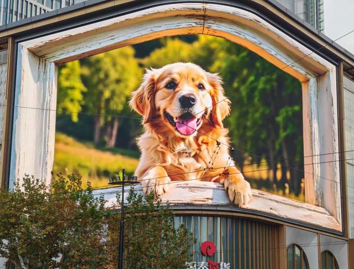 橙友@临海凭风:路过武林广场,一抬头,看见银泰百货外墙的巨幅电子频里,一只金毛犬趴在仿窗框造型中,吐着可爱的舌头微笑着,毛发在暖光下泛着柔亮光泽,背景是葱郁绿意,立马感到快乐又温馨。