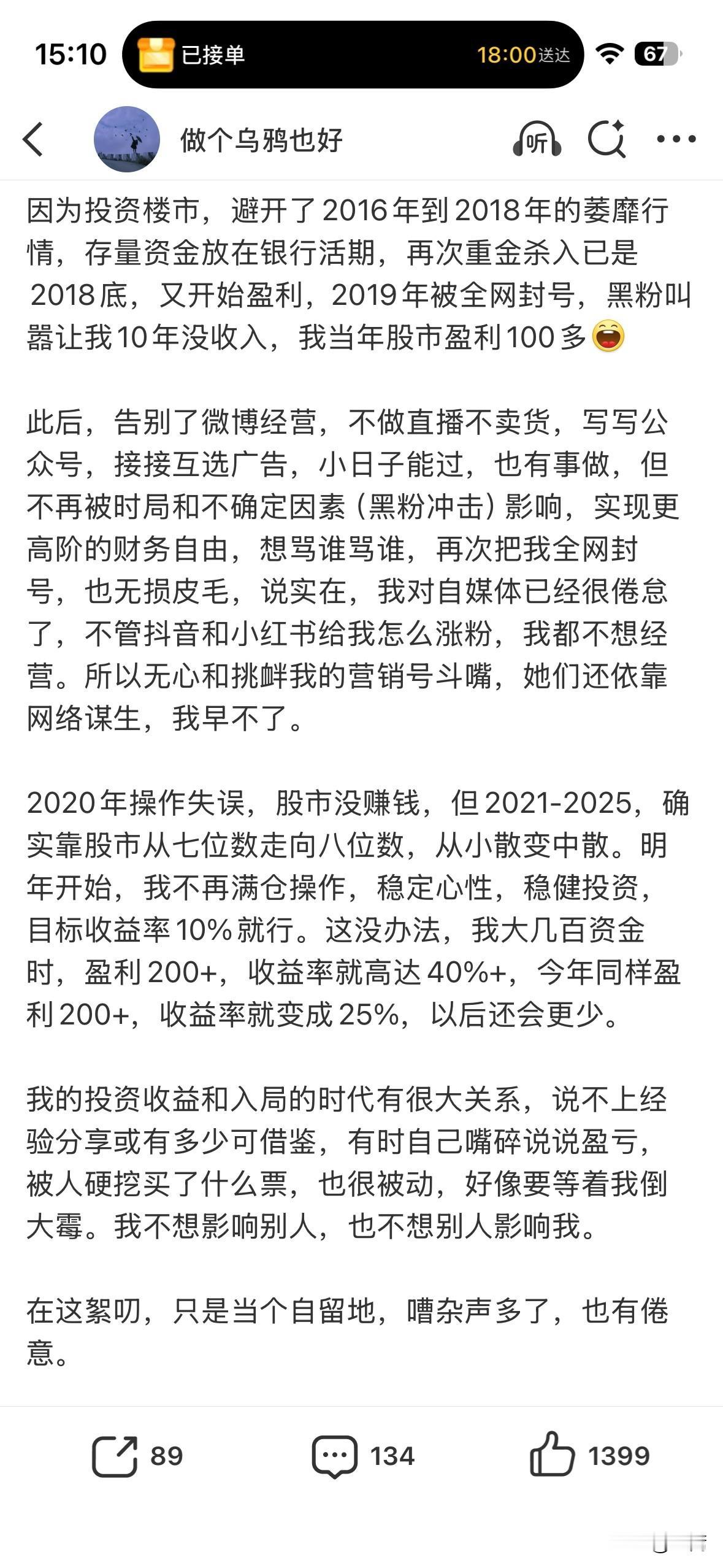 很多人不知道初代网红木子美,早已经实现了财富自由。股票账户八位数,从小散到中散。她说今年投资以稳字为主。看来在八位数的财富面前,再怎么蹦跶的木子美,也开始爱惜羽毛了,虽然是黑的。毕竟微博名就是做个乌鸦也好。这份坦荡,全网望过去,也还是少见的。 她说自己2020年操作失误,股市没赚钱,但2021-2025,确实靠股市从七位数走向八位数,从小散变中散。2026年开始,她不再满仓操作,稳定心性,稳健投资,目标收益率10%就行。这没办法,她大几百资金时,盈利200+,收益率就高达40%+,今年同样盈利200+,收益率就变成25%,以后还会更少。 说实话,我相信木子美说的话,也相信她的账户变化和那些收益率都是真实的。 别问我为什么。 财富自由的前提,需要很强的外运加持。财富自由之后,进入心力和玄学命题。