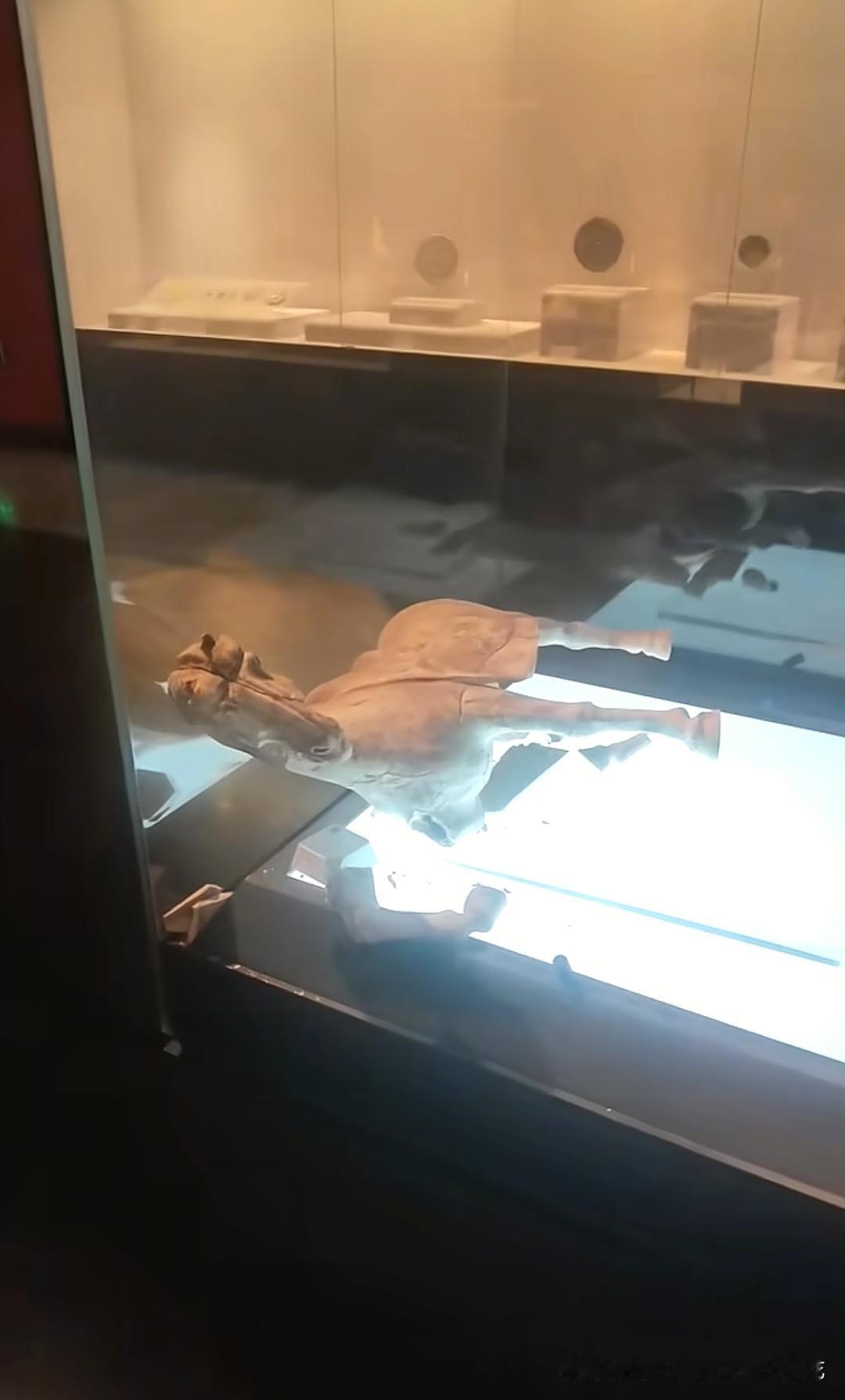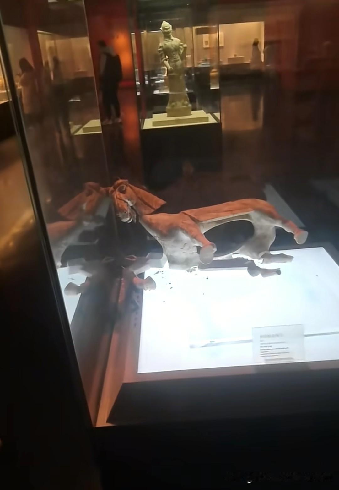 这是1988年偃师市出土的唐代陶马,有网友称自己在洛阳博物馆看到了陶马倒下断裂的一幕,好好的一个珍贵文物就这样碎了,没有任何外力,怎么就突然倒下碎了呢?有网友留言:“这是提前帮属马的挡煞除太岁了吗?” 从图片来看,陶马出土的时候不是完整的,应该被考古工作者修复过的。要知道,绝大部分青铜器和陶器出土的时候基本都是碎的,很少会有完整的,如今修复技术非常成熟,无论是什么样的碎片都可以修复完整。如果一出土就是完整的,一般不会这样轻易摆在展示柜里的。