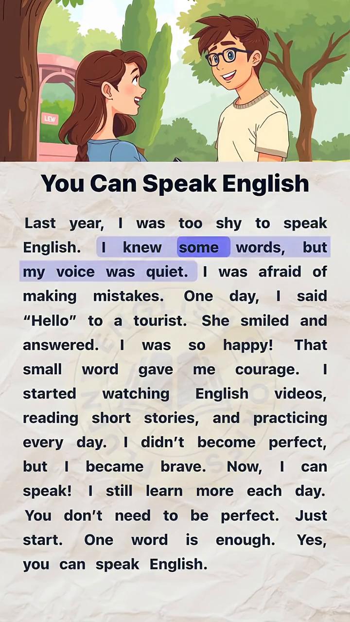 You Can Speak English? Last year,I was too shy to speak English.I knew some words,but my voice was quiet.I was afraid of making mistakes. One day,I said"Hello" to a tourist. She smiled and answered. I was so happy!That small word gave me courage. I started watching English videos,reading short stories,and practicing every day.I didn't become perfect,but I became brave.Now,I can speak!I still learn more each day. You don't need to be perfect.Just start.One word is enough. Yes,you can speak English.