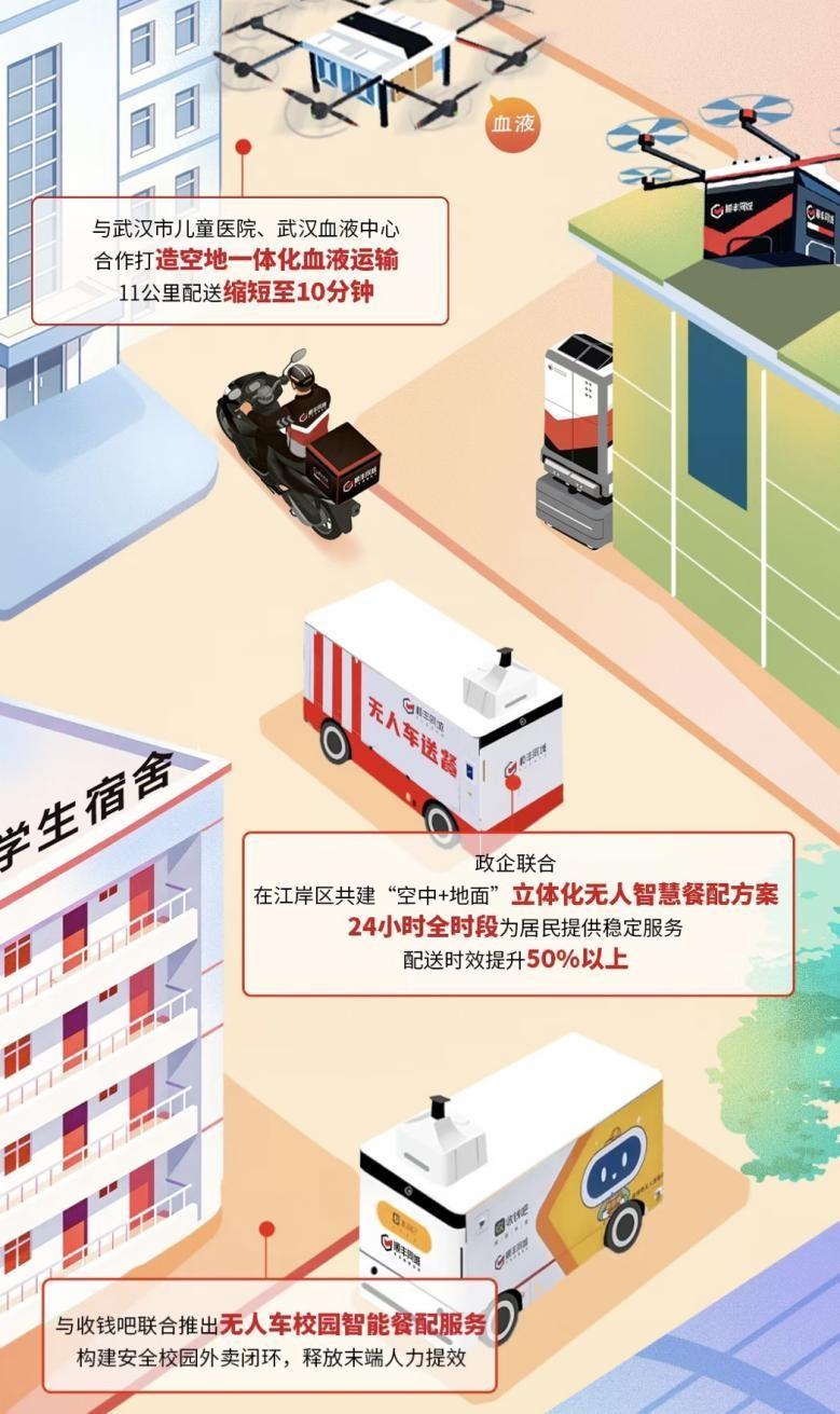 随着无人车能力升级,顺丰同城“二轮+四轮+无人配送”多元运力体系日趋完善,不断探索智慧物流的新场景:与肯德基、收钱吧等联合推出无人车智慧配送服务,提高不同场景接驳的灵活性;携手武汉市儿童医院、武汉血液中心合作打造空地一体化血液运输,为医疗应急场景提供配送保障;与武汉江岸区政府、百胜餐饮合作,打造“空中+地面”立体化无人智慧餐配方案,满足用户在交通不便地区、夜间或高峰时段以及恶劣天气等场景下对餐配服务的需求。在人机协同提效下,顺丰同城正在加速构建更智能、更弹性、更高韧性的下一代即时配送网。