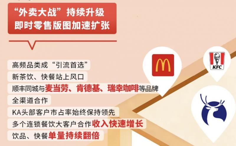 以外卖大战的主力餐饮品类为例,麦当劳、肯德基、瑞幸、霸王茶姬均与顺丰同城达成深度合作,实现全渠道配送。近年茶饮品牌发力私域运营,小程序下单率开始反超外卖平台,顺丰同城通过“驻店+商圈+全城”的多元定制化运力解决方案,保证灵活调度和高效履约。据悉,今年集中上市的蜜雪冰城、古茗、霸王茶姬,外卖大战里爆单的茉莉奶白,以及早就占据优势地位的瑞幸,均为顺丰同城的重点客户。