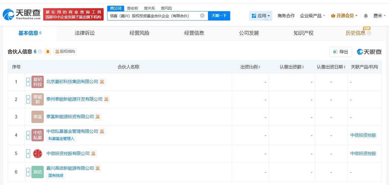 中信投资控股等在嘉兴成立股权投资基金出资额7亿 天眼查App显示,12月30日,信嘉(嘉兴)股权投资基金合伙企业(有限合伙)成立,执行事务合伙人为解强,出资额7亿人民币,经营范围为以私募基金从事股权投资、投资管理、资产管理等活动,由中信私募基金管理有限公司、中信投资控股有限公司、北京夏初科技集团有限公司等共同出资。 天眼查信息:
