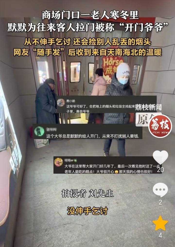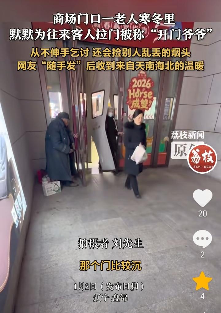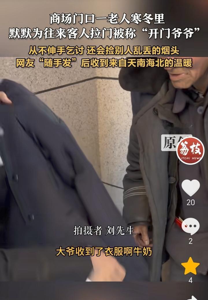 “被暖到了”!辽宁盘锦,寒冬里一位70岁的老人站在商场门口,为来往客人拉门,他从不伸手乞讨,还会捡别人乱丢的烟头,广大网友得知后纷纷给老人送了衣服和牛奶,让老人这个冬天不会在那么寒冷。 看完视频之后被暖到了,老人默默为大家付出,从来没有索要任何回报,多亏了有好心人的拍摄,不仅让我们得知了有这样一位无私奉献的老人,而且也让老人得到了网友们的捐赠,让老人在这个冬天不再那么寒冷。 希望当地能给予老人适当的帮助,让老人能够安度晚年。