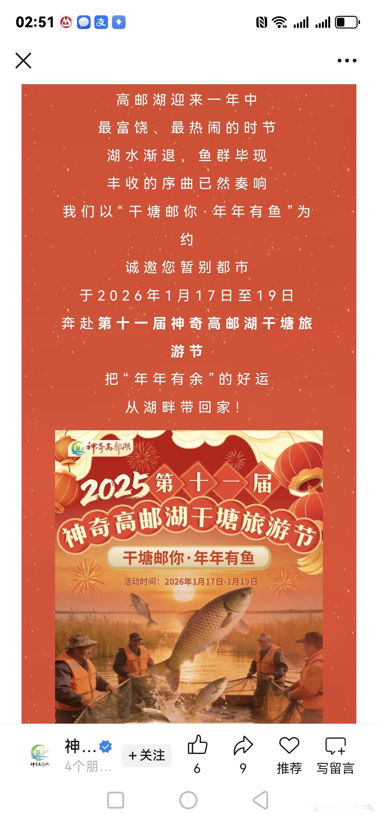 第十一届高邮湖干塘节 正式招募!第十一届神奇高邮湖干塘旅游节:寻鱼鲜、战牌桌、挖野趣,等你入席!绿水青山·美丽中国行 美丽的高邮湖,又迎来一年中 最富饶、最热闹的时节,湖水渐退,鱼群毕现,丰收的序曲已然奏响,勤劳的高邮湖人,以"干塘邮你·年年有鱼"为约,诚邀您暂别都市,于2026年1月17日至19日奔赴第十一届神奇高邮湖干塘旅游节,把"年年有余"的好运从湖畔带回家!做自然的朋友 报名链接 : 网页链接 第一球迷胖哥 济南·天下第一泉风景区