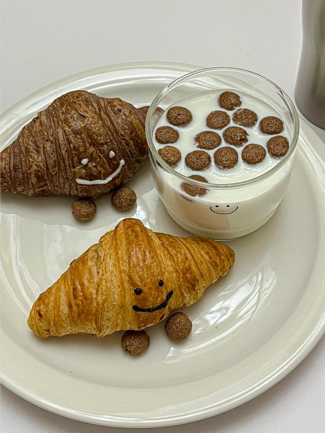 今日份早餐 原味可颂🥐✖️巧克力可颂🥐 用巧克力笔在可颂上画上小表情 是不是特别可爱,看到就觉得心情好好 再用可可燕麦球当做它的脚🦶 被萌化了🥰